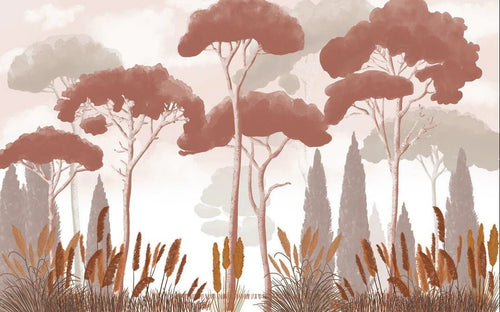 Cypress, pine, and pampas grass wallpaper in terracotta