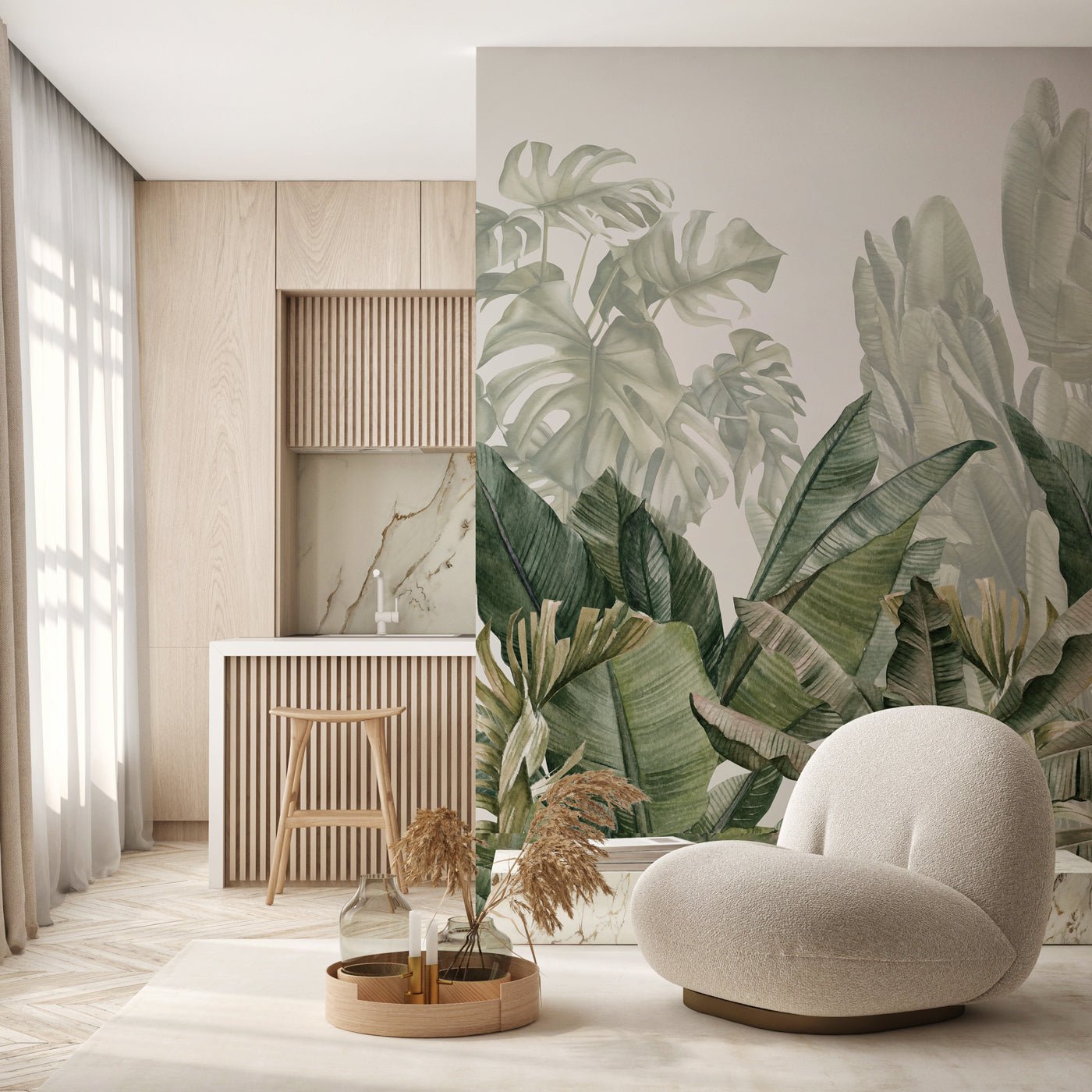 Discover our panoramic green banana wallpaper, a true invitation to exoticism and lush greenery. Transform your interior into a tropical paradise with this wallpaper featuring large, broad banana leaves.