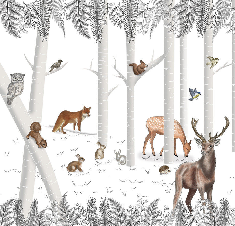 A fairytale forest, perfectly illustrated animals for a dream bedroom.