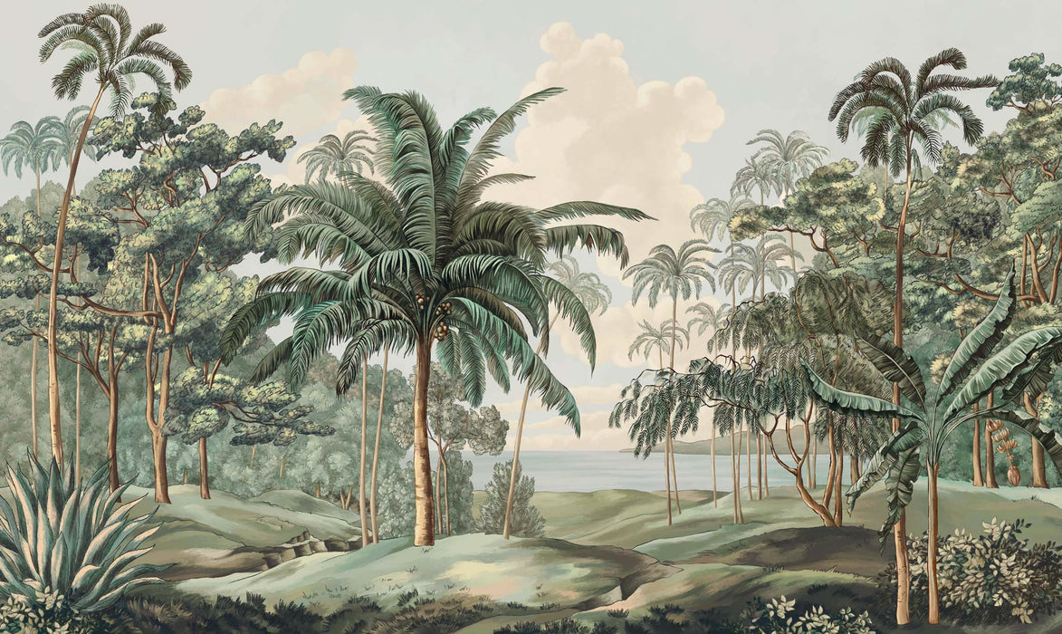 Let yourself be enchanted by the splendor of an Indonesian-style landscape wallpaper from the island of Celebes. This exceptional wall décor, where every detail is carefully hand-drawn, evokes the very essence of a lush botanical painting. With a profusion of abundant flora, this mural masterpiece instantly transforms any room into an enchanted garden. The bright, vibrant colors captivate the senses, creating a visual experience that awakens the soul and evokes deep emotions.