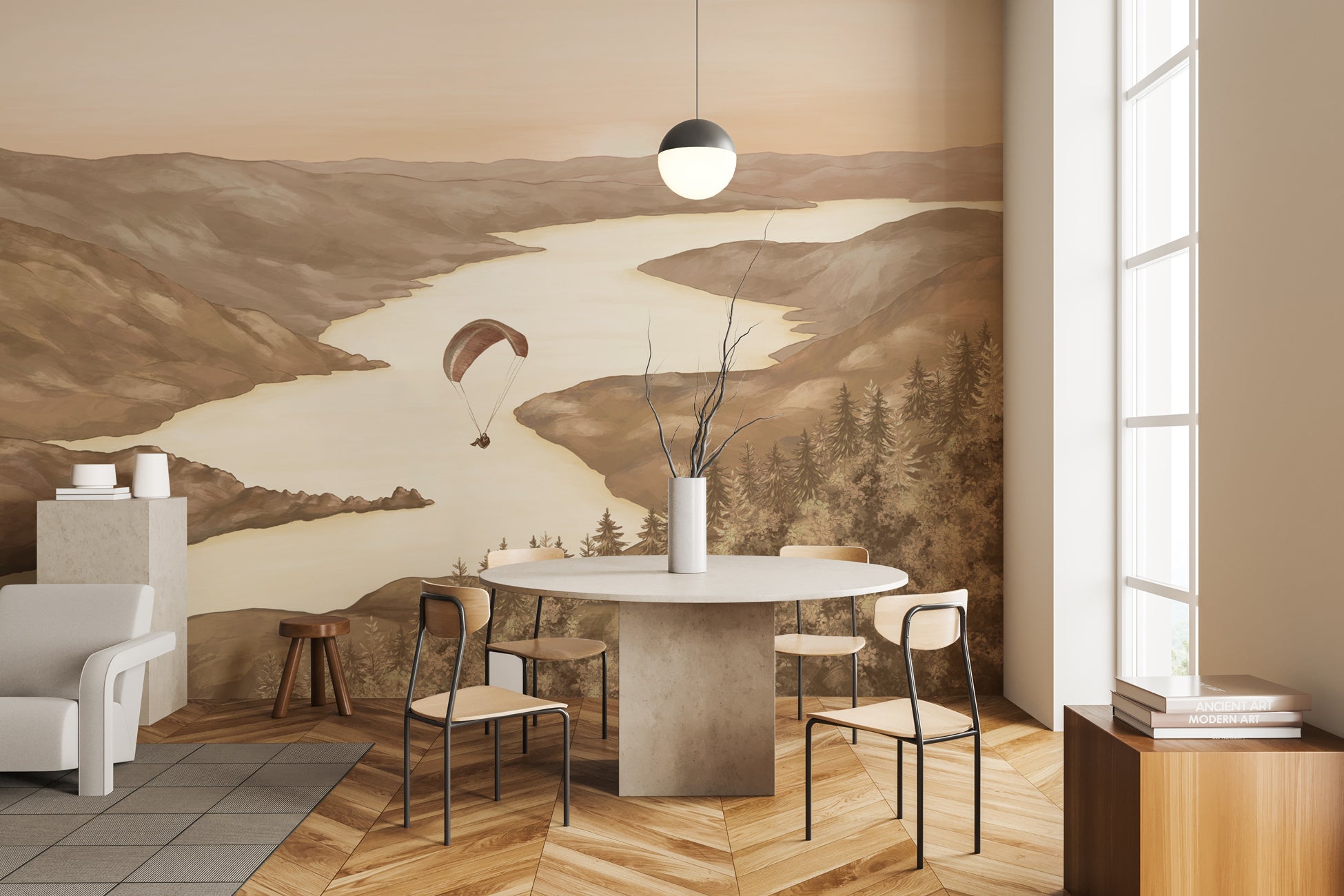 Immerse yourself in the bold, elegant world of our new col de la Forclaz sepia light wallpaper. This captivating panoramic experience transports you to the summit of the Col de la Forclaz in the French Alps, near Annecy. This bespoke wallpaper, exclusive to MuralConcept, is a masterpiece in its own right, evoking the wild beauty of nature. The colors of this panoramic wallpaper are bright and warm. This XXL wallpaper is perfect for bringing luminosity into your room.