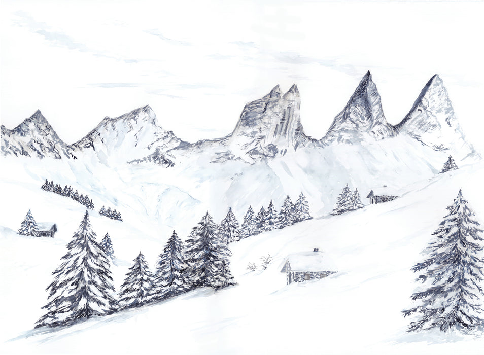 Elevate your walls with Aquarelle d'un Rêve Alpin, a unique mountain wallpaper created by artist Flora Lacour Filliol. Painted in watercolors, this work has been transformed into a high-end artist wallpaper, combining poetry and elegance.
