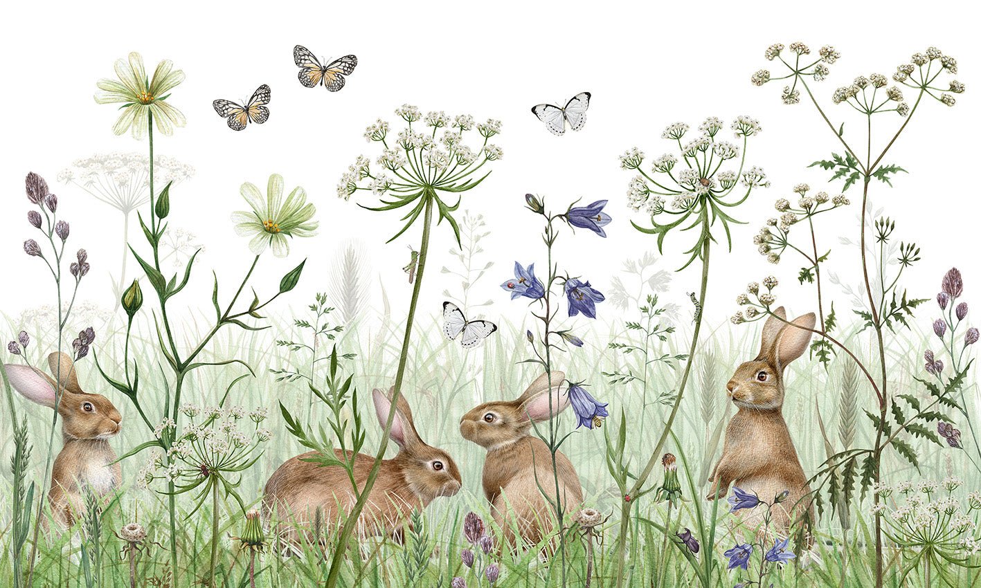 Furnish your baby's room with our rabbits baby room wallpaper. This panoramic wallpaper will awaken your child's senses, inviting him to discover shapes, colors and animals... A soft, childlike wallpaper perfect for decorating your newborn's bedroom.