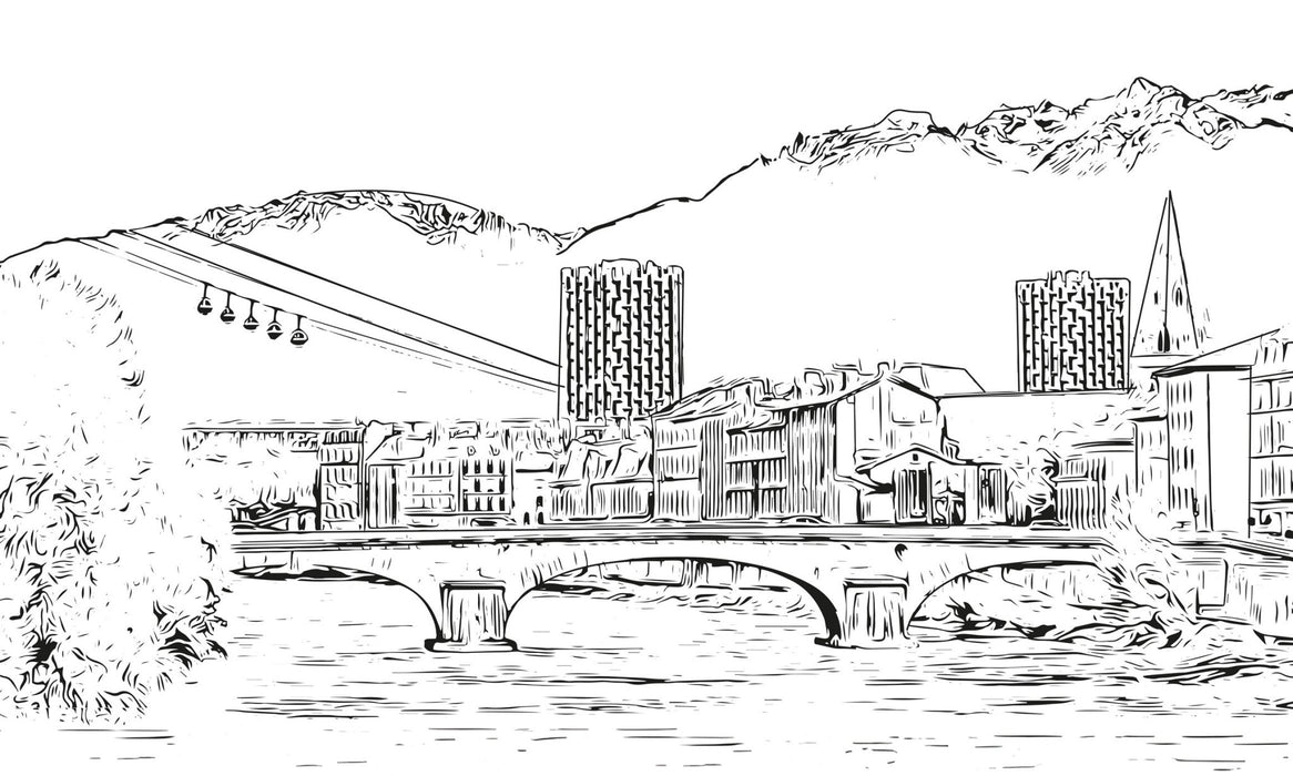 This black-and-white illustrated wallpaper depicts an iconic view of Grenoble, a city nestled in the heart of the French Alps. Several characteristic features can be seen: