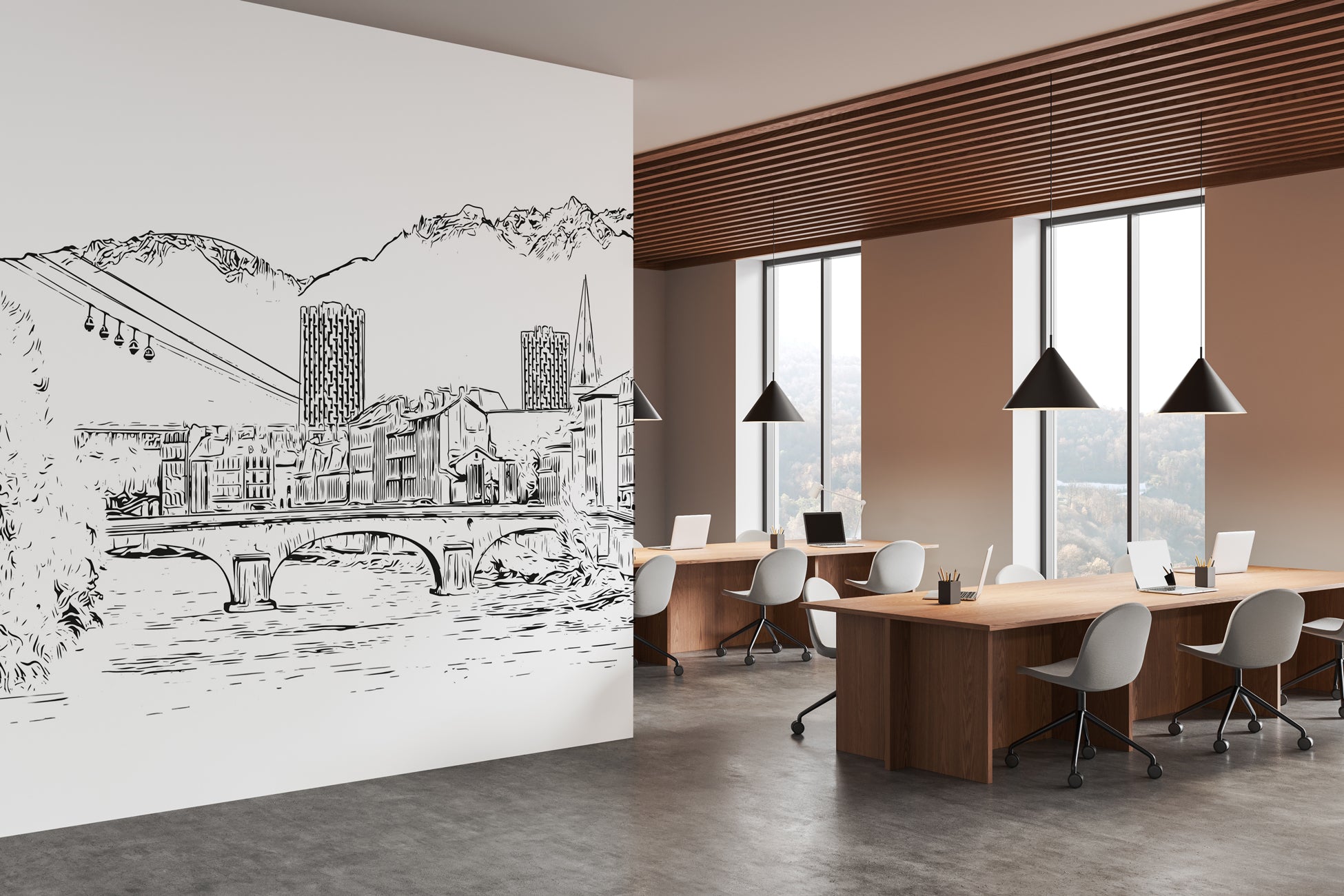 This panoramic wallpaper combines fine lines and rich detail. Its black sketch style on a white background fits perfectly into a modern professional environment, as seen in this warm and refined office space. It brings an artistic dimension, a strong local identity, and an elegant touch to the interior design.