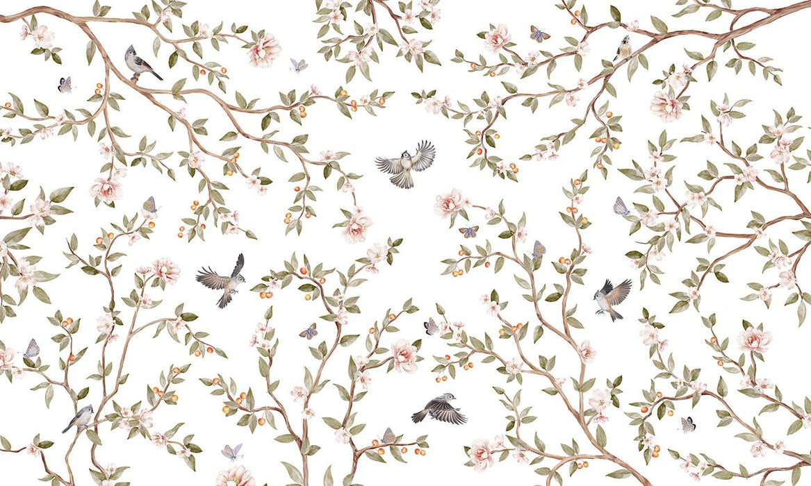 Discover our children's bedroom bird wallpaper, the vegetal bird wallpaper for a delicate and light decoration of your child's or baby's bedroom. This children's wallpaper features flowering branches adorned with birds. Soft, pastel colors for a warm ambience. This children's wallpaper is versatile: on the one hand, your child will be captivated by the stories told by this wallpaper, and will also be soothed by these gentle motifs.