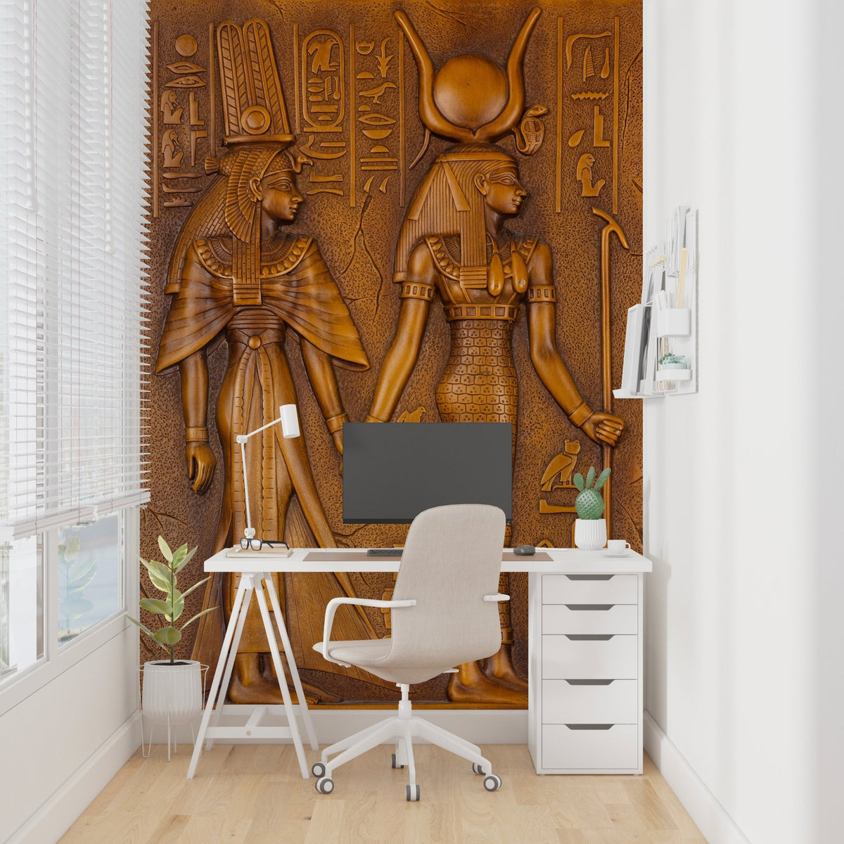 This Nerfititi and Akhenathon wallpaper was designed for fans of Egyptian culture, pyramid and pharaohs! This wallpaper will bring an ethnic, romantic and warm atmosphere to your interior. His trompe l'oeil Effect bronze will bewitched on you. He will impress all your guests. Easily create a unique interior with our wallpaper to your measurementss.