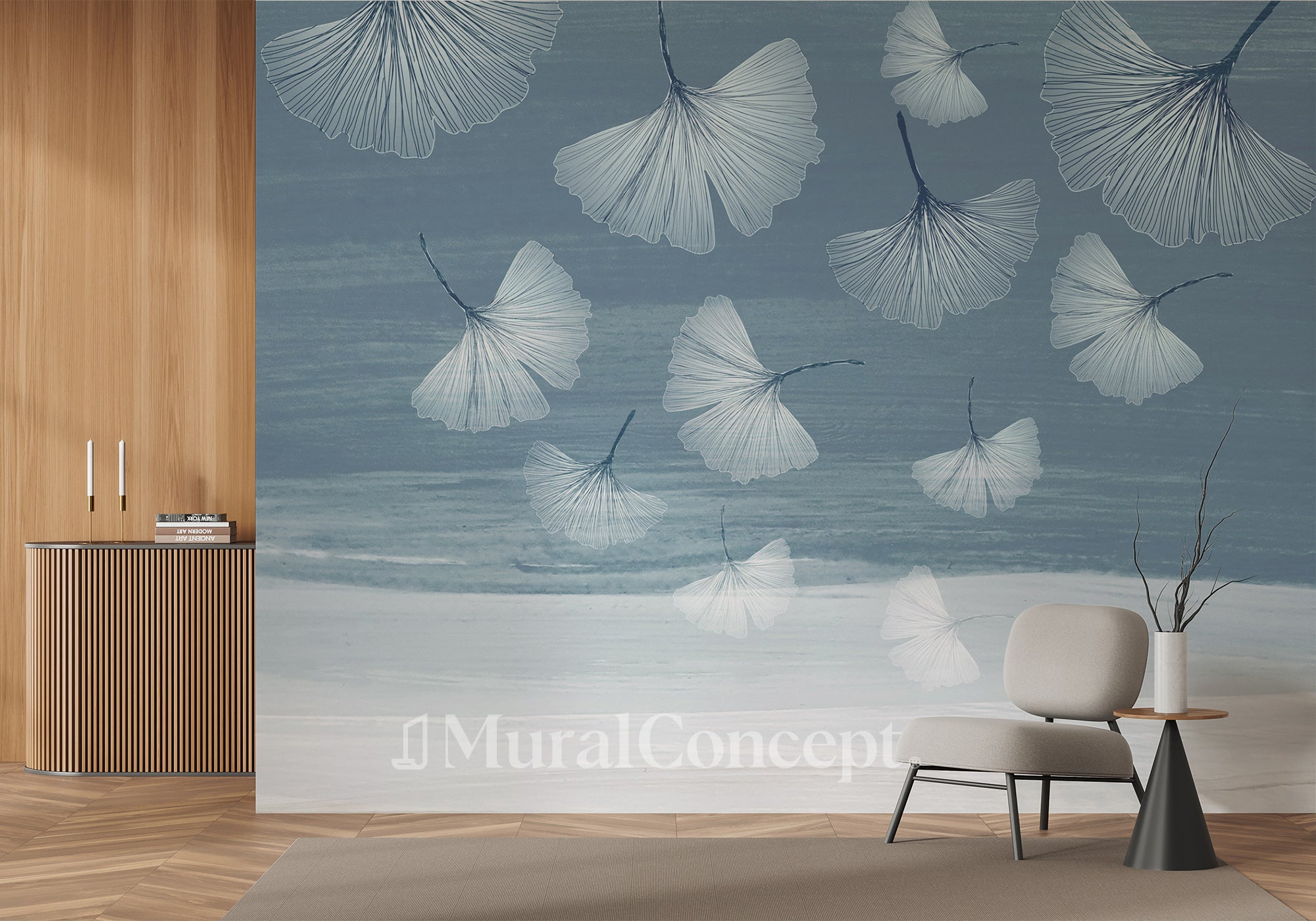 Install this japandi blue gingko wallpaper, japonisant with ginkgo biloba leaves, for a refined, elegant look in your home. A soothing, zen-like mural. This panoramic wallpaper is perfect for any room in your home, whether bedroom, living room, office or nursery. Combined with decorative objects in wood or rattan, it will transform your room. Easily create a unique interior with our made-to-measure XXL wallpaper. A trendy Asian touch. Example: Wall tapestry in very large or small dimensions.