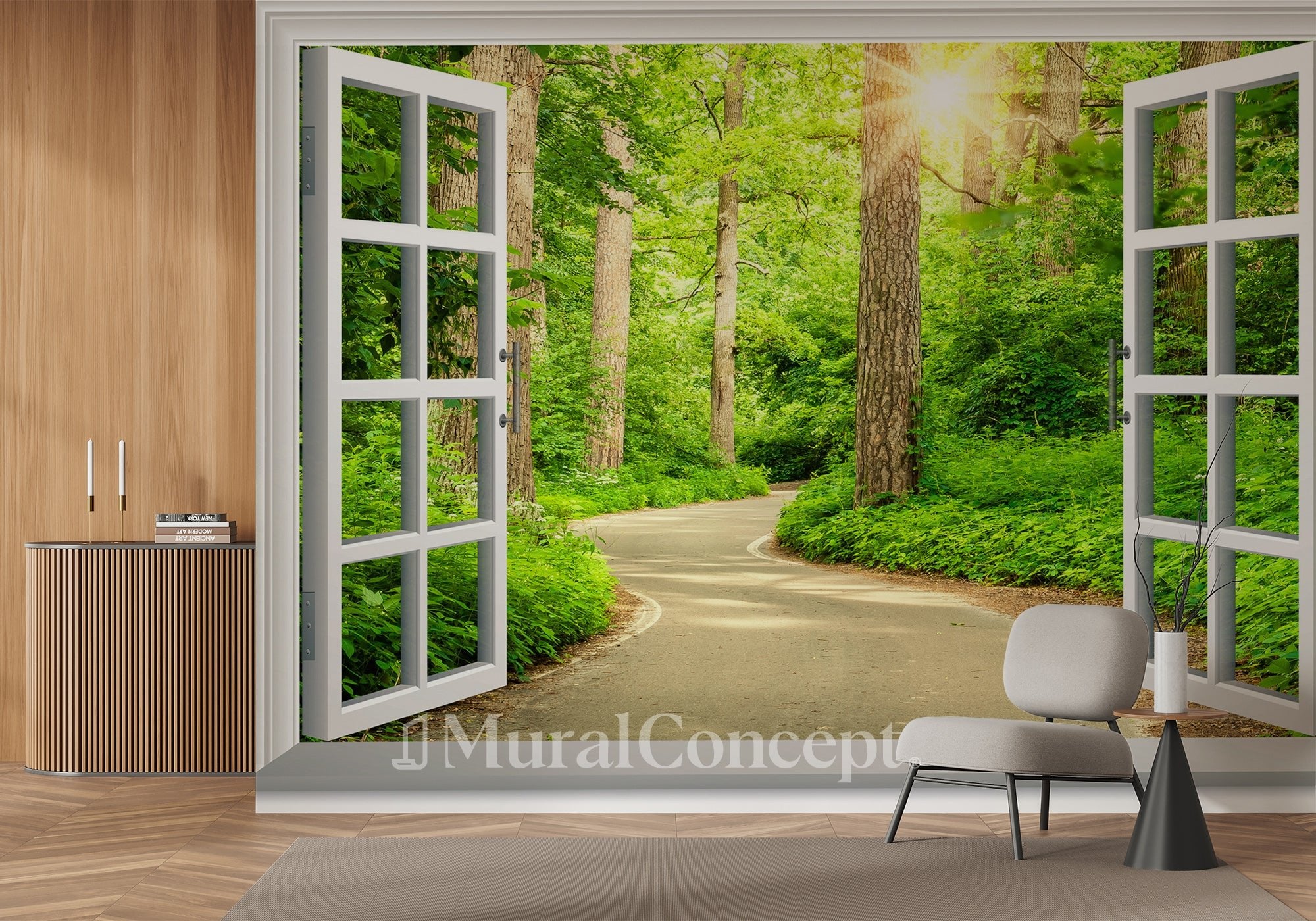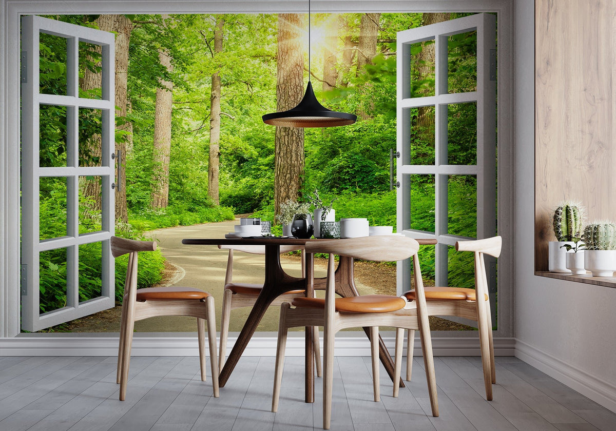 The forest walk trompe l'oeil wallpaper invites you into a surprising wall decor. Create perspective and depth in your interior. Dress your walls with a panoramic non-woven wallpaper that enlarges your room. Ideal for hallways, living rooms and bedrooms. This luminous wall decor will impress your guests. Easily create a unique interior with our made-to-measure non-woven trompe l'oeil wallpaper.