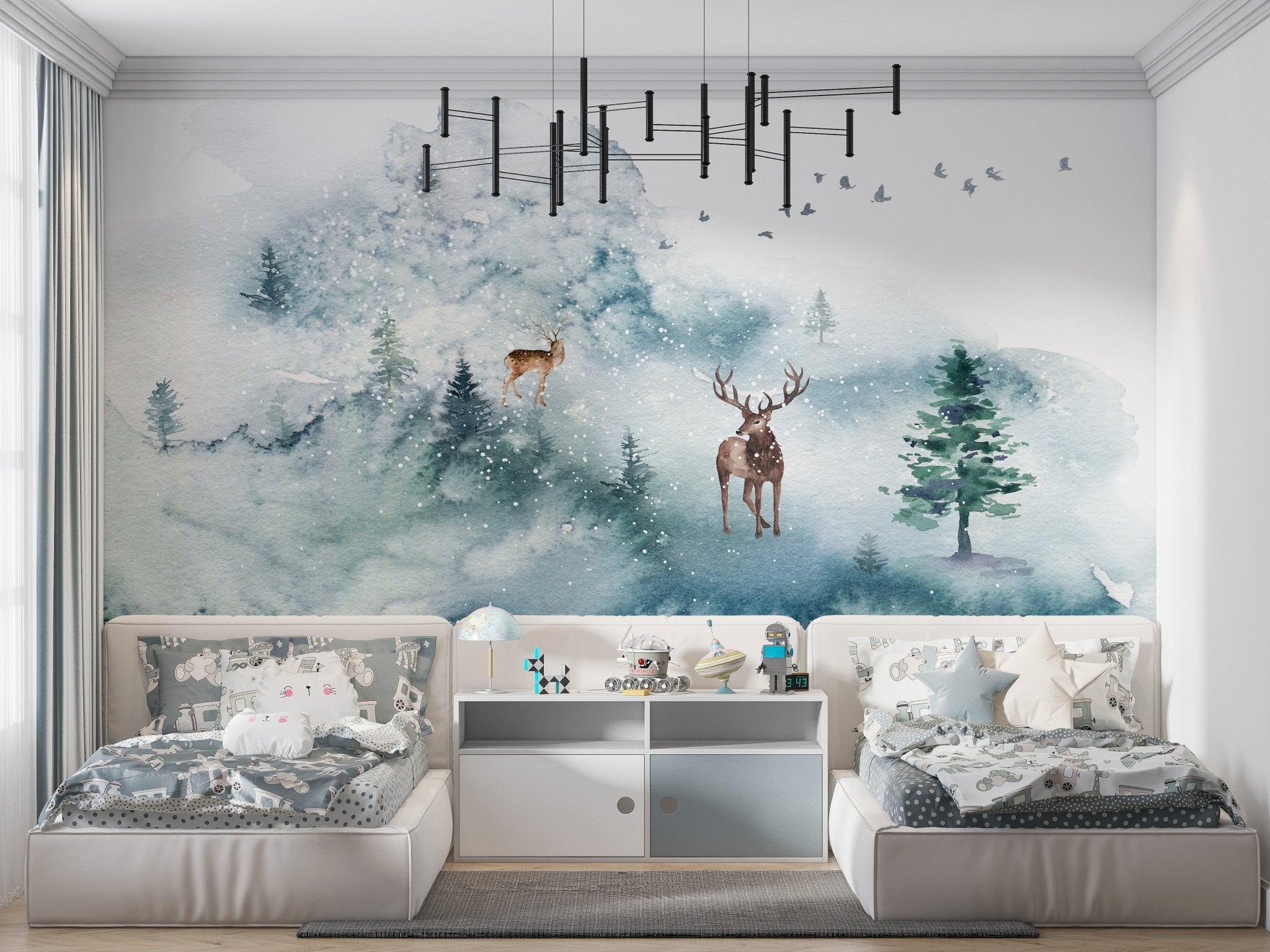 This Cerf & Scandinavian wallpaper With clean lines and fresh colors will create an atmosphere conducive to relaxation, and cheerfulness. This watercolor effect wallpaper will bring both brightness, and an elegant touch to your interior. Do you want a decor with Scandinavian looks?  Go for it, this is this wall decor that you need!