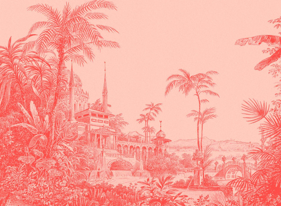 Enhance your interior with our red monochrome temple jungle wallpaper. Available in two colors (beige or red), this mural decorates your walls with taste and delicacy. This jungle wallpaper will charm you and your visitors. We love this bespoke panoramic for its detail and soft curves.