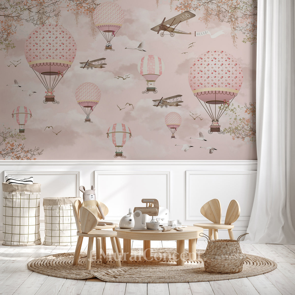 Our peach-pink hot-air balloon animals wallpaper, in pastel tones, will transport your child to the conquest of the sky.. A superb visual ensemble to fascinate and entertain your child. Easily create the imaginary world they've always dreamed of with our custom-made wallpaper! Available in Blue or Peach Pink. Buy wallpaper for your child's bedroom online, and create a healthy, responsible decor.