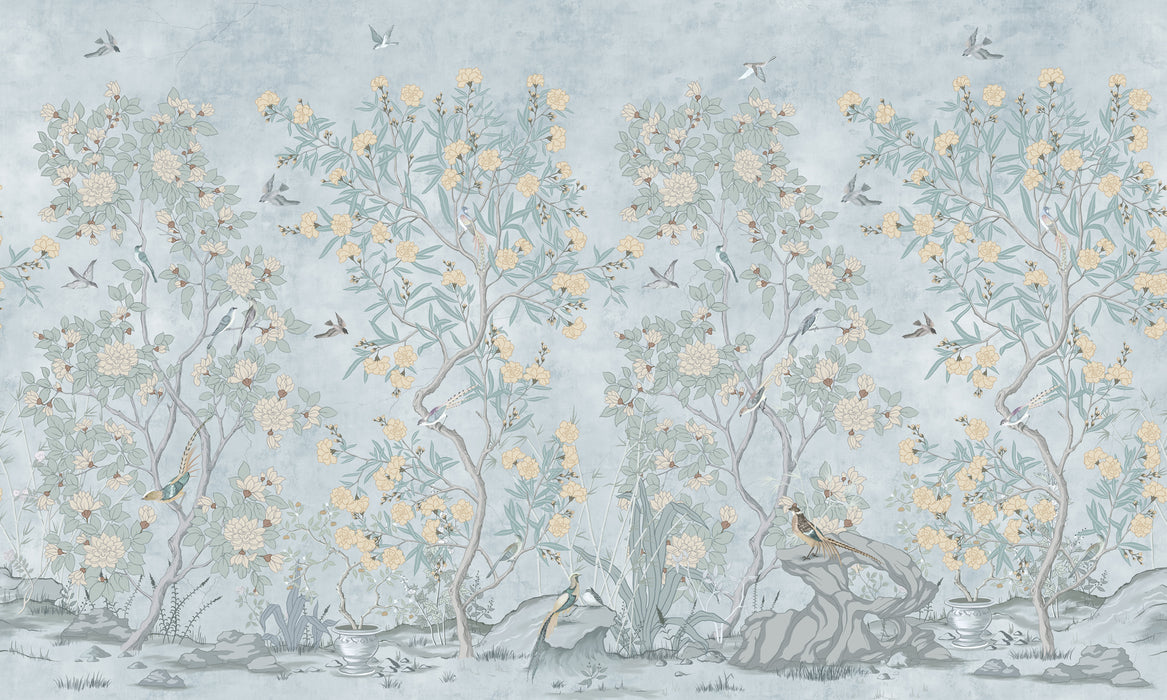 This chinoiserie wallpaper depicts a plant and floral decor, with soft, pastel colors. Birds accompany the painting to add softness and originality.
