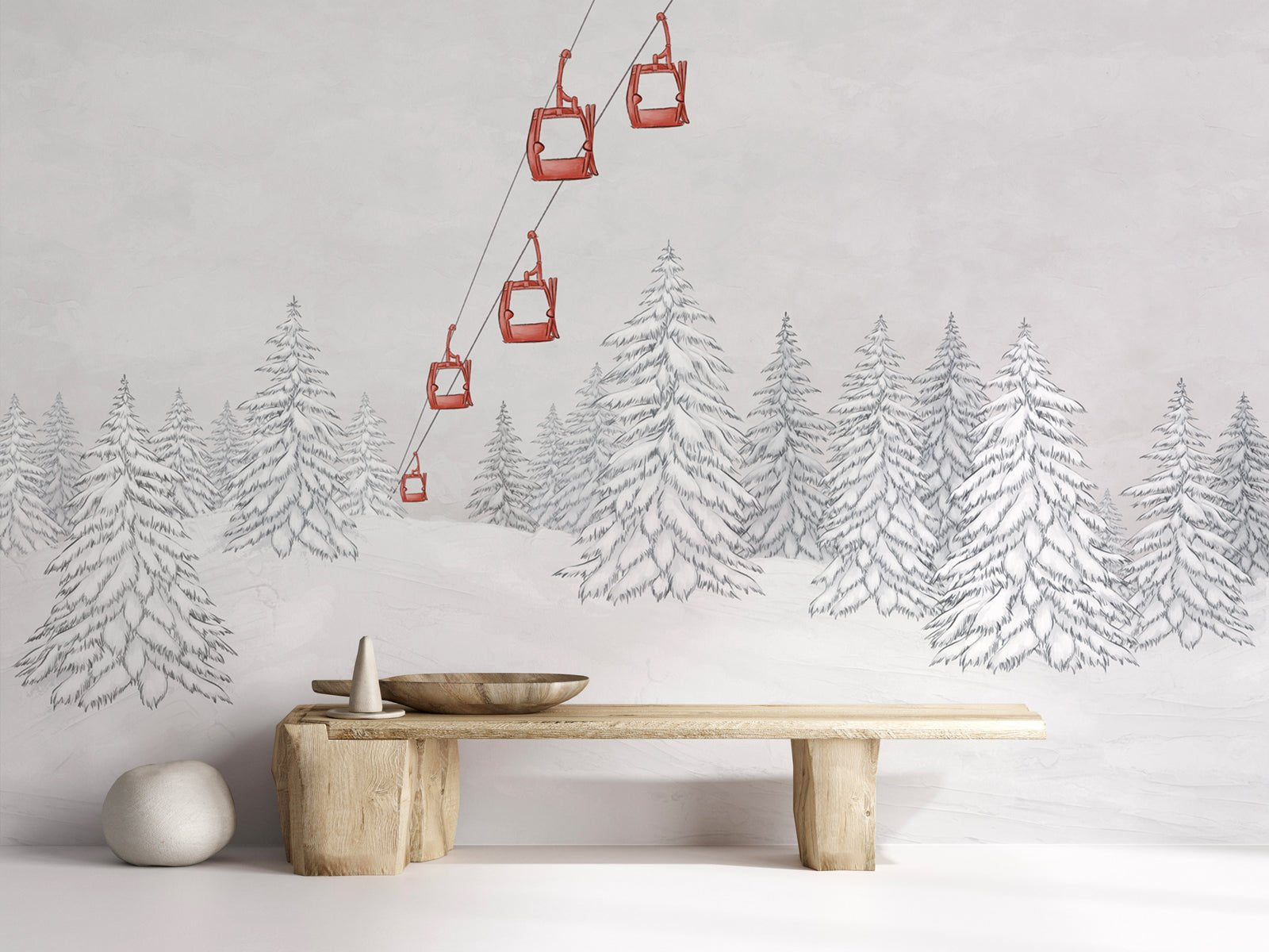 With our red gondola mountain wallpaper, experience the excitement of winter sports and the splendor of the mountains. Our panoramic wallpaper is inspired by the timeless beauty of the French Alps. This panoramic mountain wallpaper is a tribute to winter sports. At once Scandinavian and minimalist, it will find its place in a bedroom, living room, hotel lobby or office.