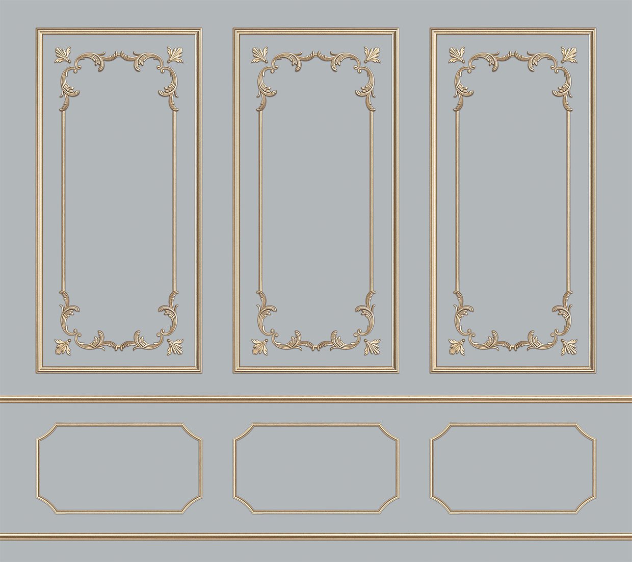 Parisien style gold molding wallpaper is a trompe l'oeil that will bring elegance and refinement to your interior. Its grand design adds light and perspective to your room. A panoramic wall decor that will impress your guests. Easily create a unique interior with our custom non-woven wallpaper.
