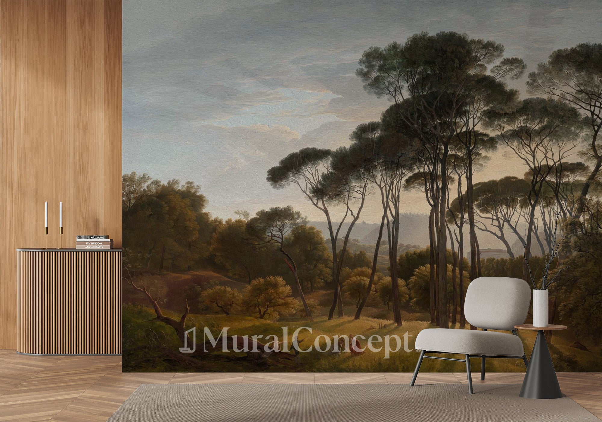 Italian landscape wallpaper this bespoke panoramic wallpaper is perfect for elegant, contemporary interiors with old-world design. Buy panoramic wallpaper online to personalize your interior. In a living room, bedroom or office, this panoramic wall decor will bring both style and a sophisticated touch to your decor. Discover this famous, historic Italian landscape with umbrella pines, a painting by Hendrik Voogd1807. A panoramic wallpaper bathed in golden light and emotion.