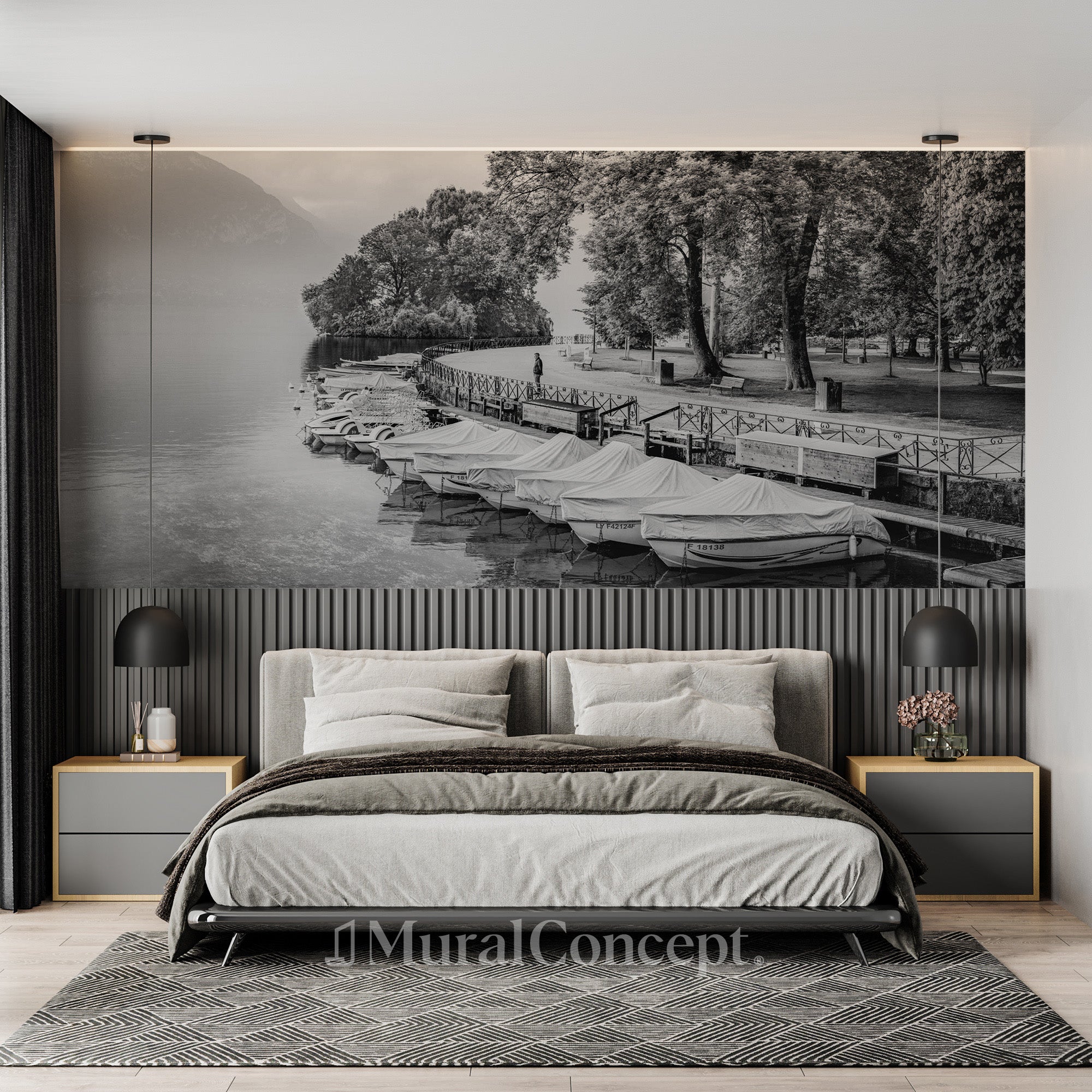 Get closer to nature with our Lake Annecy contemplation panoramic wallpaper. This panoramic wallpaper will create a relaxing atmosphere in your home. Its soft, enveloping curves will enhance your interior design. This panorama is a black and white photo of Lake Annecy and its mountains taken by our artist photographer @YoanB.pictures. The quality of this photo allows us to print in large format.