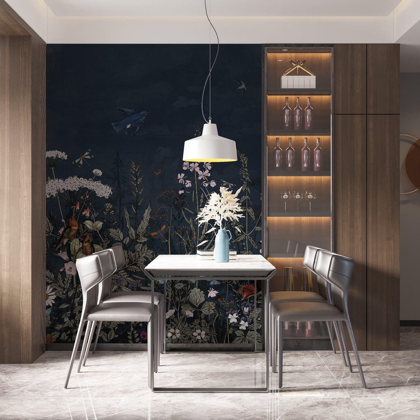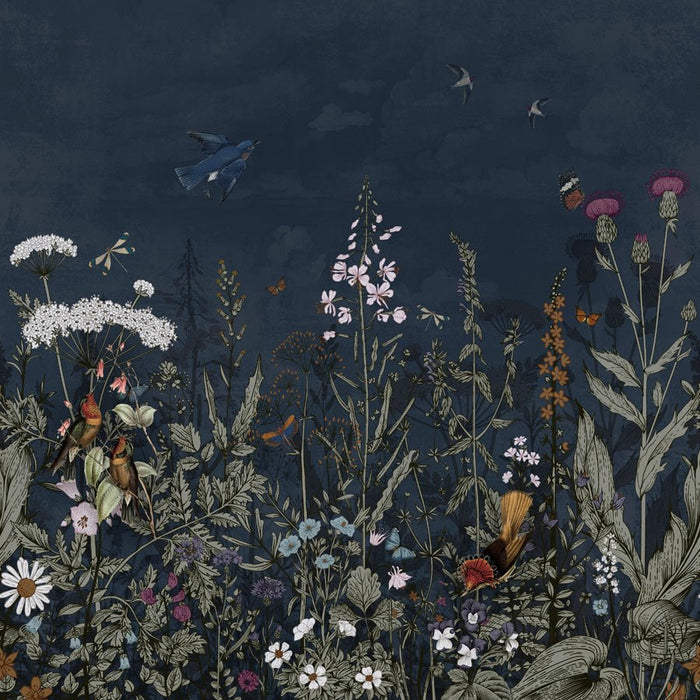 Panoramic night-blue floral wallpaper