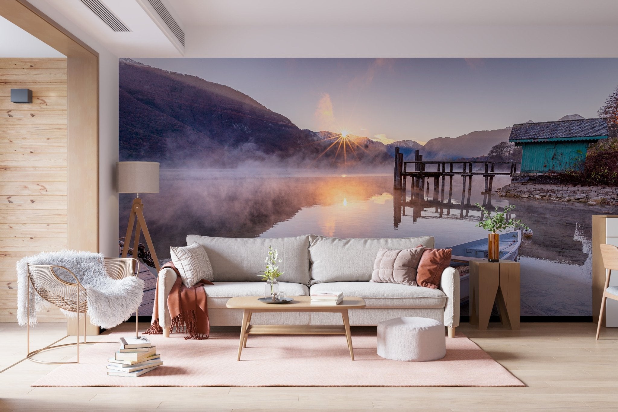 The sunrise is accompanied by a solitary boat floating on the calm waters of Lake Annecy, a pontoon stretching out into the water and a breathtaking view of the majestic Alpine mountains. The misty lake adds a touch of mystery and calm to the atmosphere of your home.