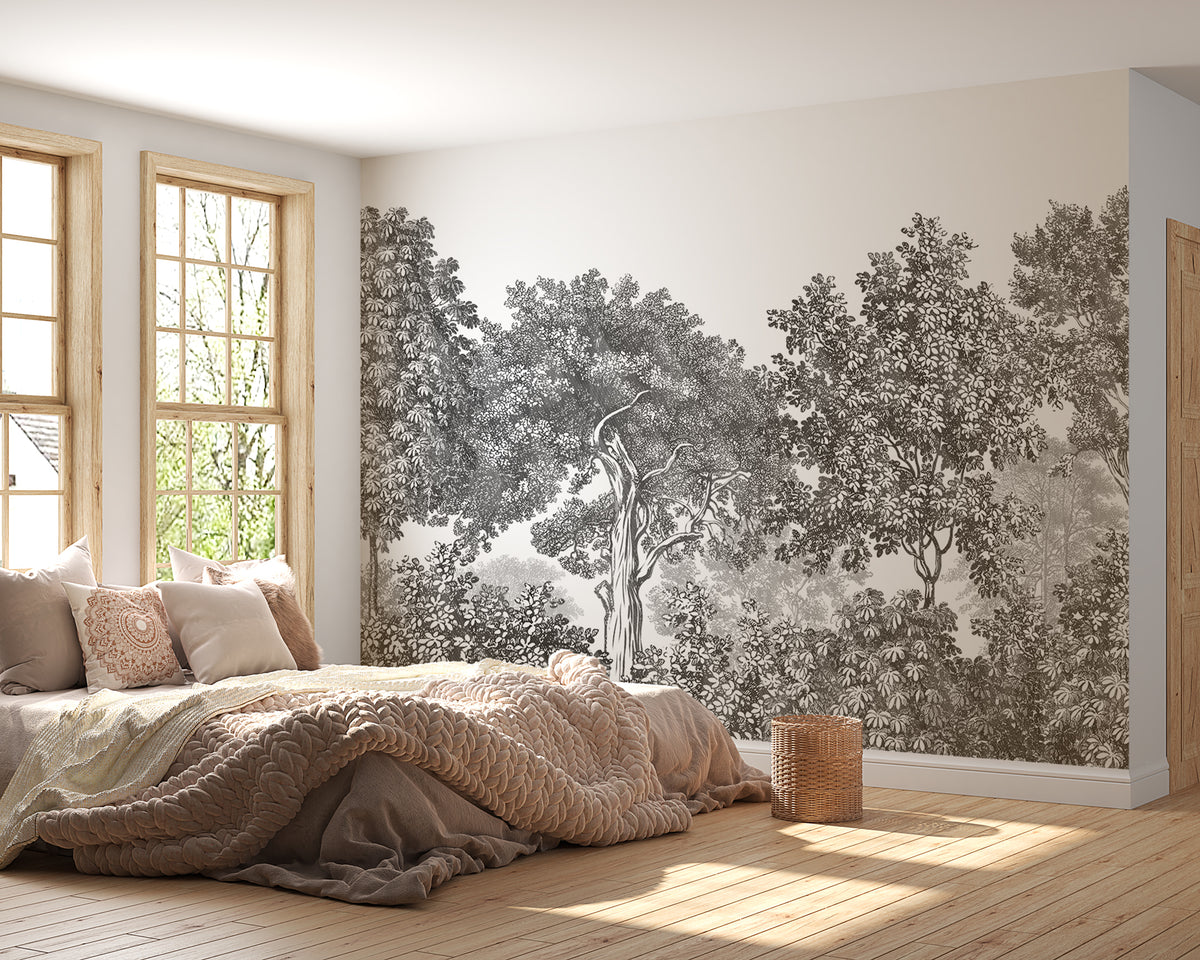 Enhance your interior with our black and white engraved forest landscape wallpaper. This wallpaper, available in several colors , is ideal for bringing elegance to your interior while adding greenery. A modern wallpaper with refined details.