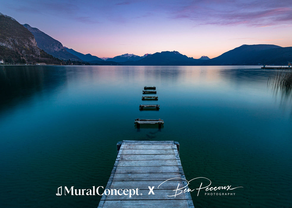 Discover our magnificent Annecy secret pontoon wallpaper, the result of a collaboration with photographer @Benpeccoux, which will bring a touch of charm and serenity to your interior design. This panoramic wallpaper features a sunrise on the shores of Lake Annecy in Haute-Savoie, with a pontoon inviting you to escape.