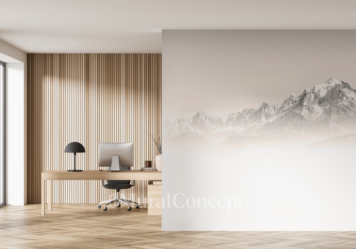 Personalize your office with the Mont Blanc dans la brume sépia office wallpaper, an original and elegant wall decoration idea. Our wallpapers are suitable for professional environments and ERP establishments. Our wallpapers are fireproof. Our professional wallpapers are resistant and high quality. Decorate your business with panoramic wallpaper to create a warm atmosphere. Define your corporate identity with made-to-measure wallpaper. Buy custom wallpaper online now.