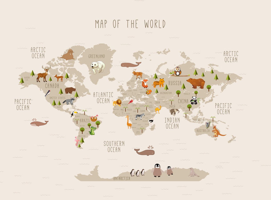 This beige Animals illustrated world map wallpaper is perfect for playfully decorating a child's bedroom. The pastel colors and animals of the world will give a soft style, and an atmosphere conducive to relaxation. A superb visual ensemble to fascinate and entertain children. Easily create a playful, childlike decor with this custom-made wallpaper! Your wall decor is printed on a waterproof wallpaper with a shiny silky fabric effect.