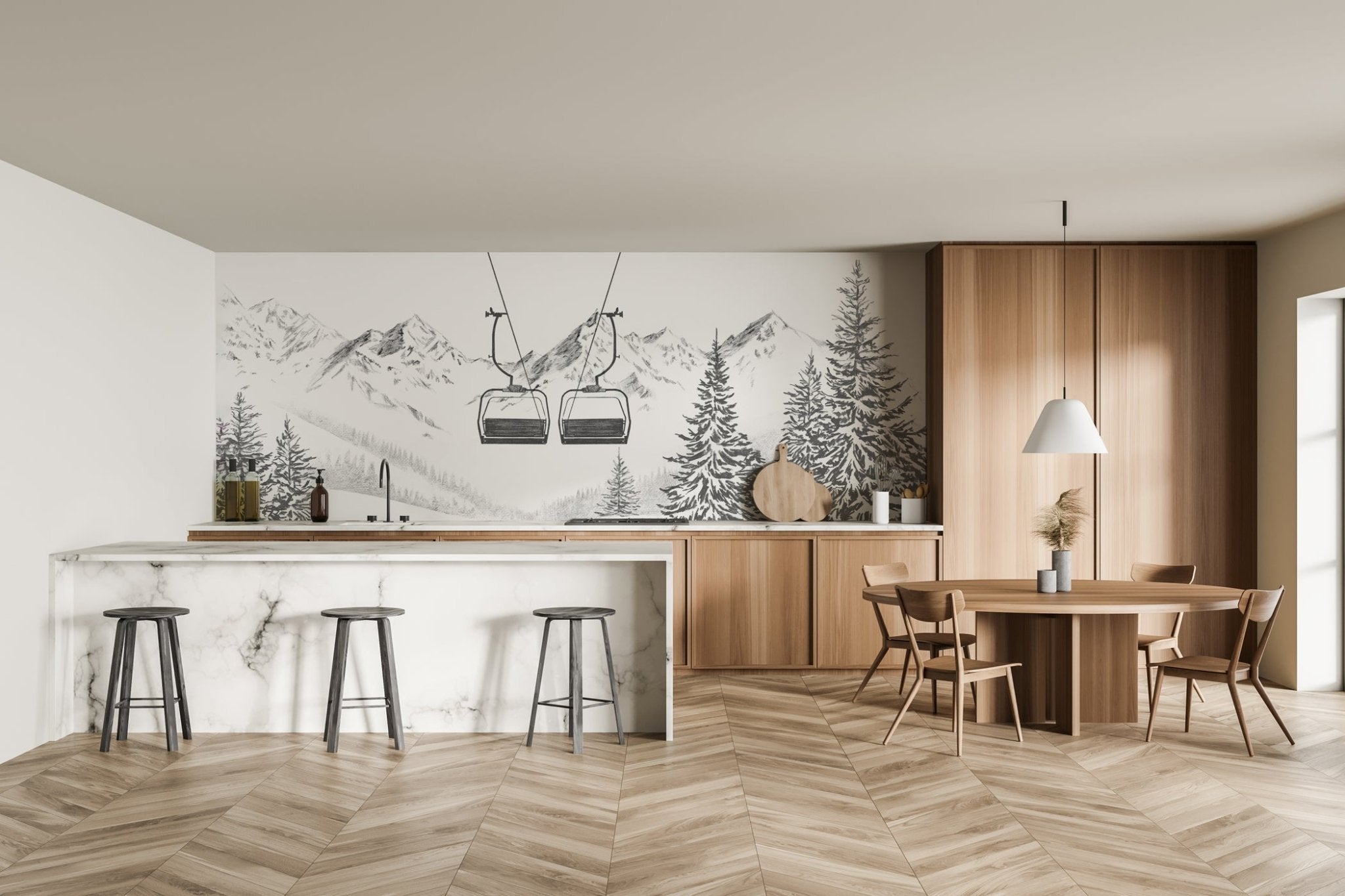 Give your walls a unique look with Immersion Alpine, a black and white wallpaper that transforms your interior into a life-size panorama. Snow-covered fir trees, majestic peaks, and cable cars are delicately outlined to recreate the authentic atmosphere of Alpine resorts.