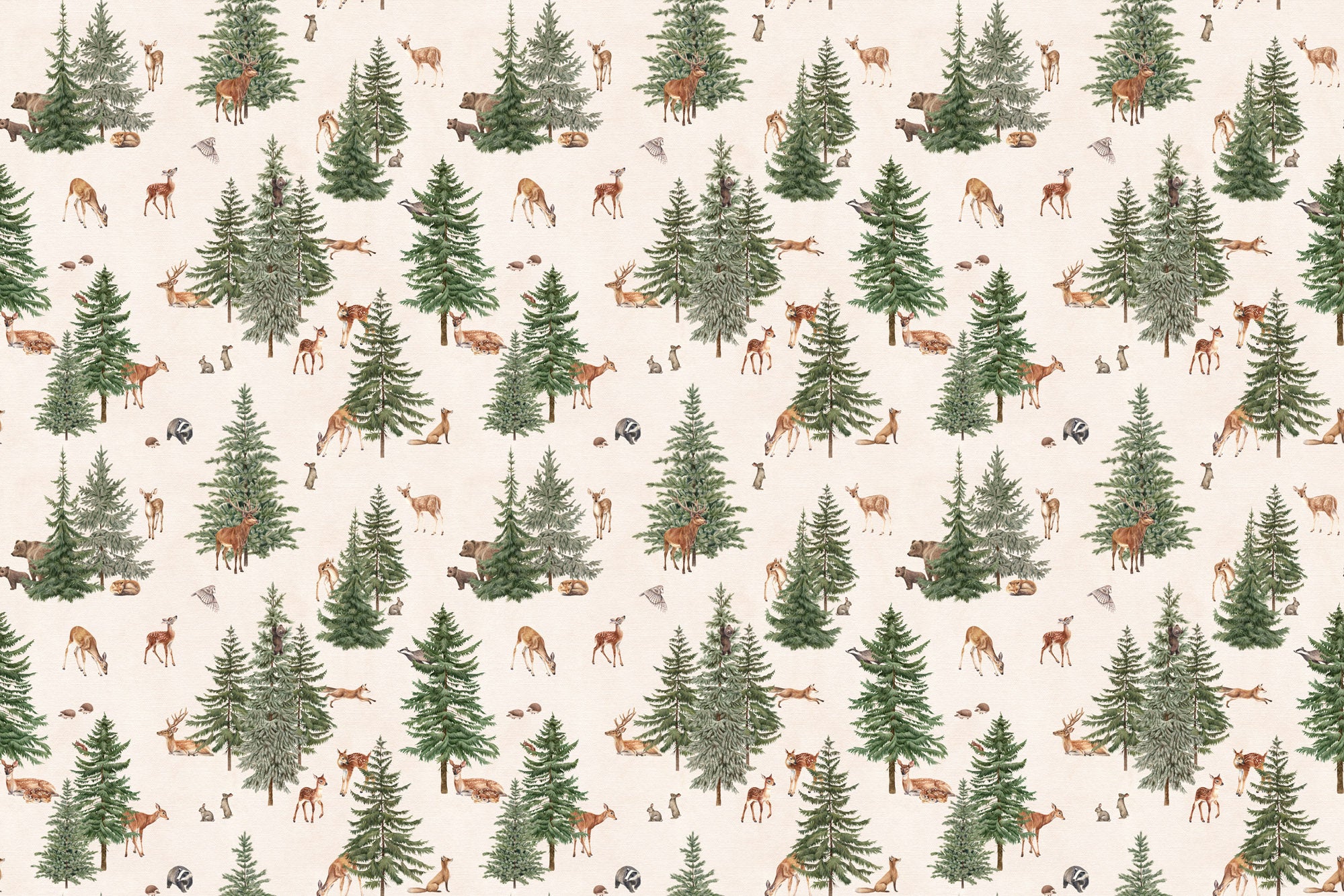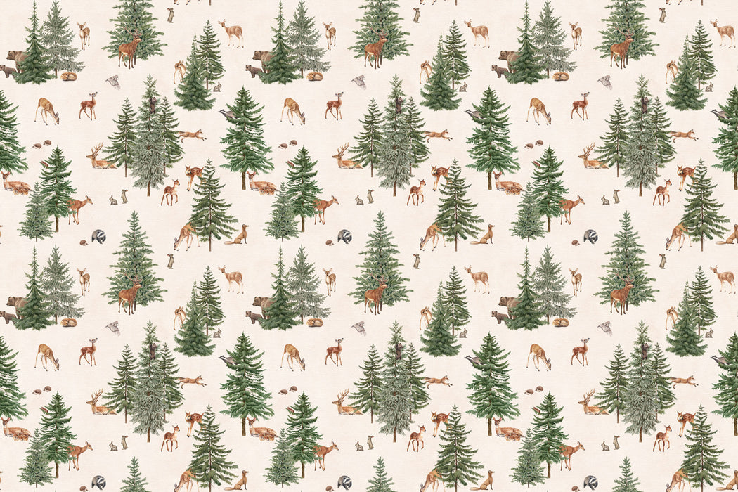 Ce décor mural met en scène une forêt délicate et apaisante, illustrée avec des sapins élancés et une faune douce composée de cerfs, biches, renards et petits animaux, sur un fond clair et lumineux. Chaque détail est issu d’une création originale, pensée pour apporter une atmosphère naturelle et chaleureuse à votre intérieur.