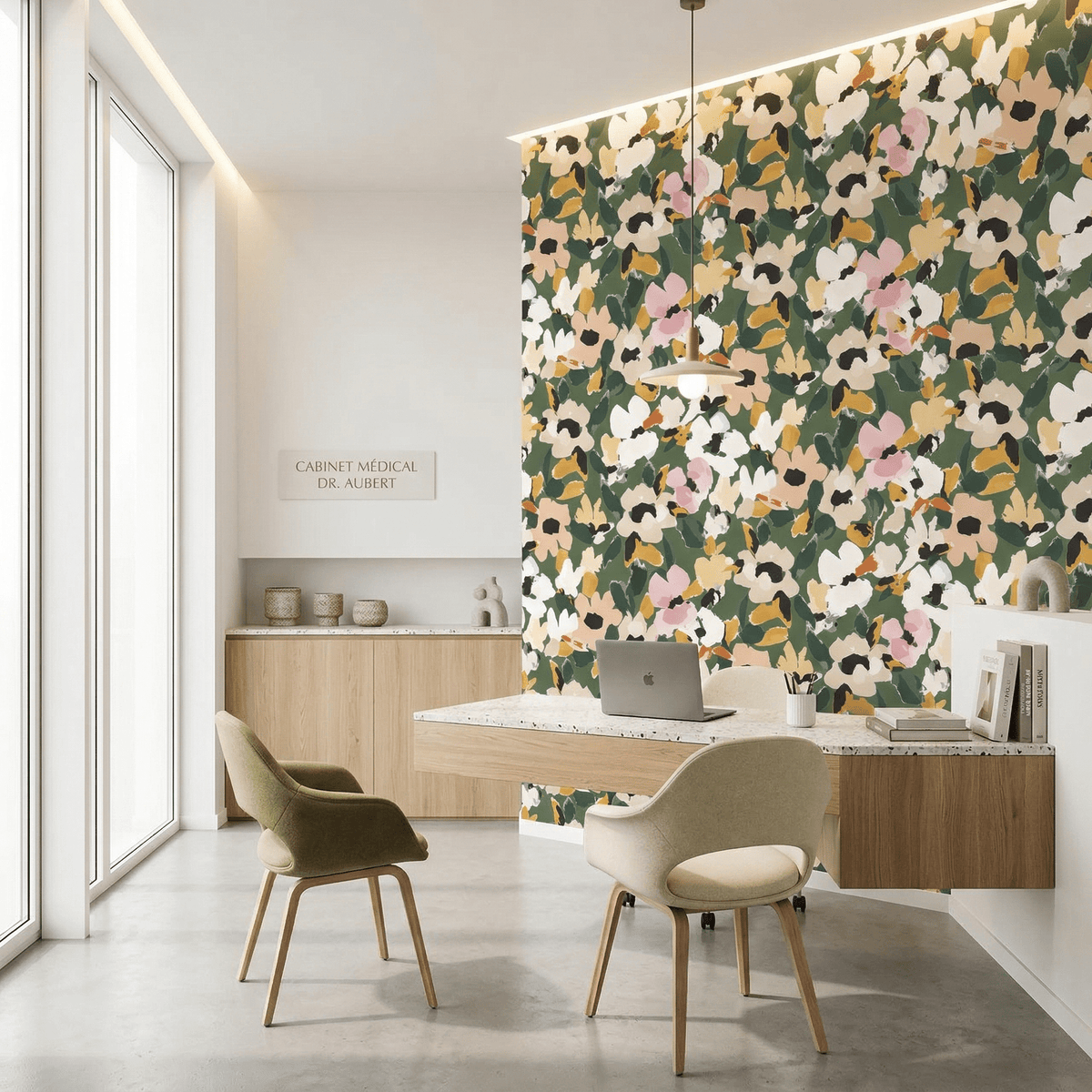 Ce papier peint motif fleurs se distingue par son style dense et artistique, mêlant des nuances de vert profond, beige, rose et ocre pour créer une ambiance dynamique et élégante. Idéal pour une chambre moderne, une entrée, un espace professionnel il permet de créer un mur fort en caractère, notamment en tête de lit.