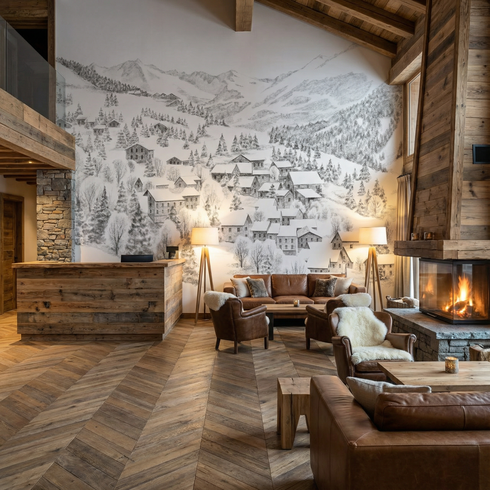 Parfait comme papier peint hôtel, papier peint chalet ou papier peint montagne professionnel, il valorise les halls d’accueil, salons, lobbys, suites et espaces lounge en offrant une immersion visuelle raffinée et intemporelle. Il est également adapté aux intérieurs des particuliers dans un couloir, une chambre ou un salon pour apporter un atout déco personnalisé