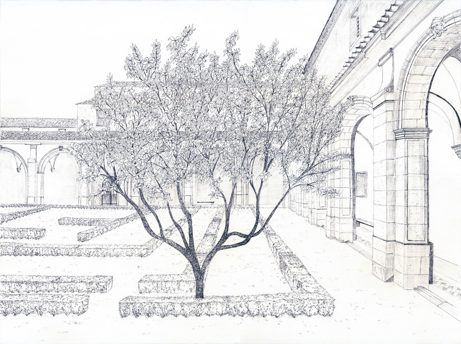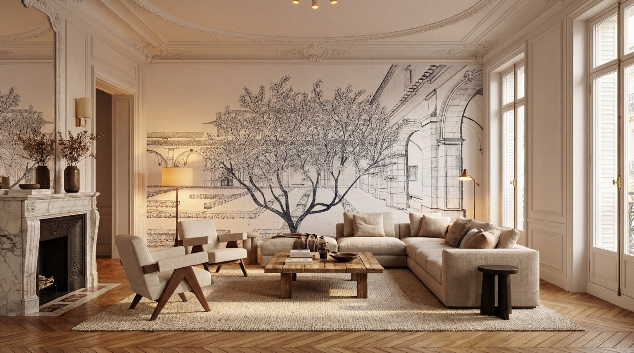 Entièrement réalisé au crayon noir par notre talentueuse artiste Flora Lacour Olliol, ce papier peint artistique met en scène un paysage architectural et végétal où les arcades minérales dialoguent avec la douceur des arbres. Le trait fin et précis évoque l’univers de la gravure et confère à ce papier peint panoramique haut de gamme une élégance intemporelle.