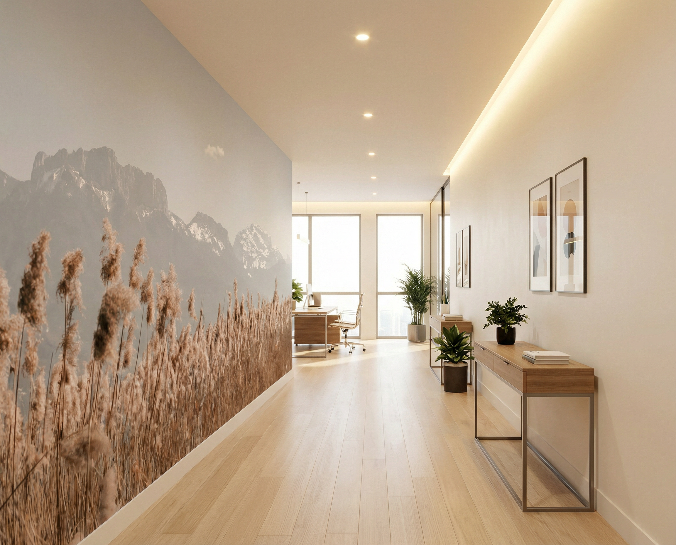 L’image joue sur des teintes douces, minérales et lumineuses, qui donnent de la profondeur à l’espace et installent une ambiance apaisante, presque méditative. Ce panoramique est idéal pour créer un mur signature dans un salon, une chambre, un espace d’accueil ou un bureau, en apportant une sensation d’évasion et de grand air.