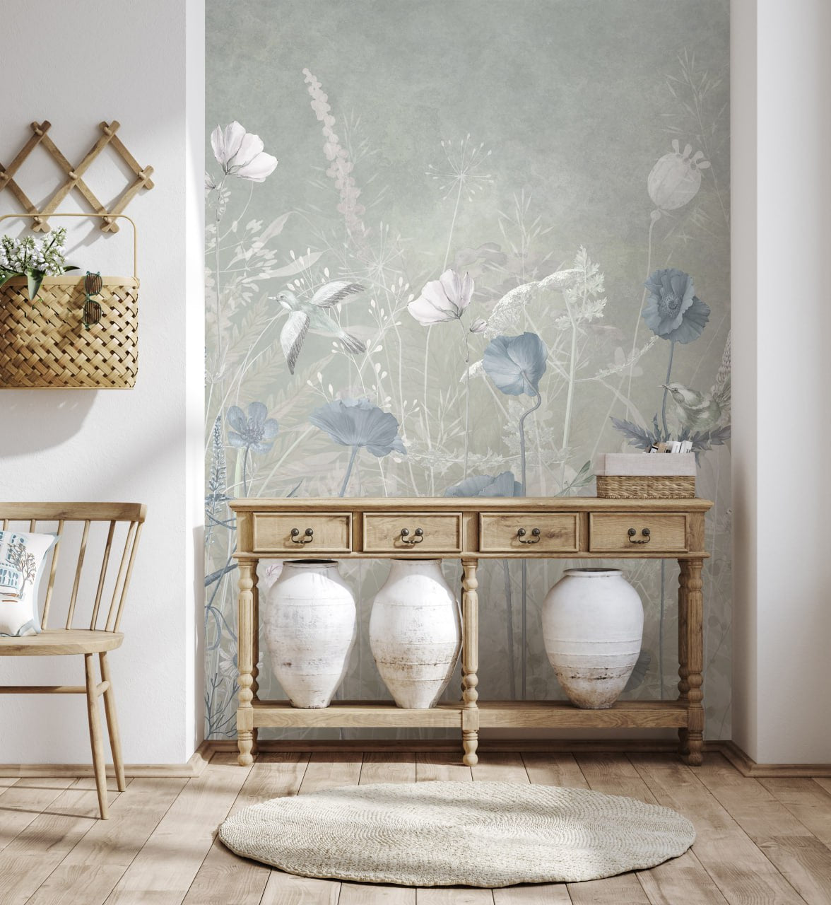 Les fleurs aériennes et les tons bleus apaisants composent un décor murale sur mesure à l'équilibre subtil, propice au calme et à la contemplation.