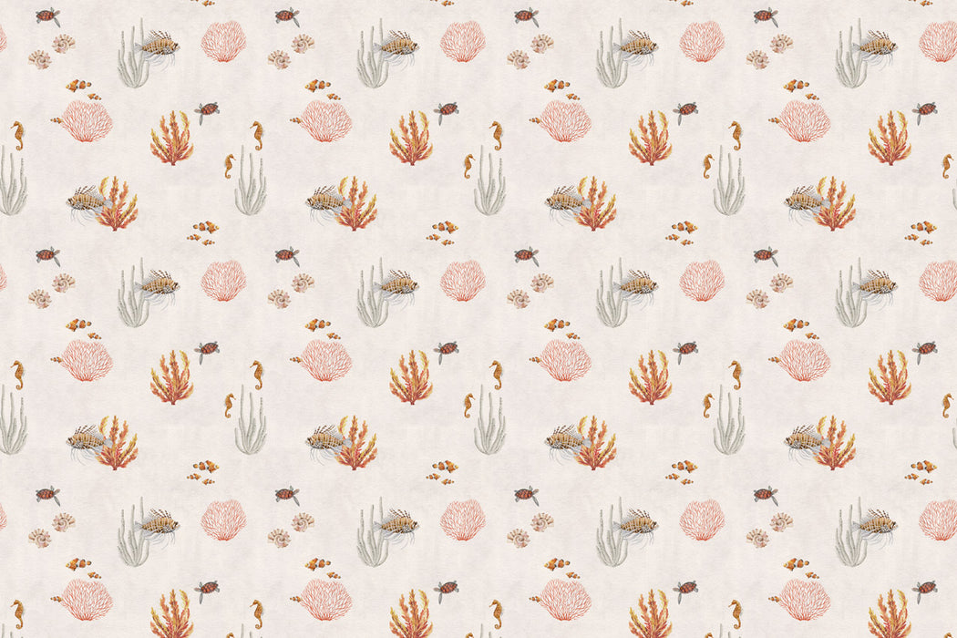 Un jardin marin délicat s’étend sur les murs, comme une plongée paisible dans les fonds océaniques. Coraux aux formes légères, algues ondoyantes et petits habitants marins semblent flotter doucement dans une eau calme et lumineuse. Chaque motif évoque le mouvement lent de la mer, créant une sensation de sérénité et d’évasion.