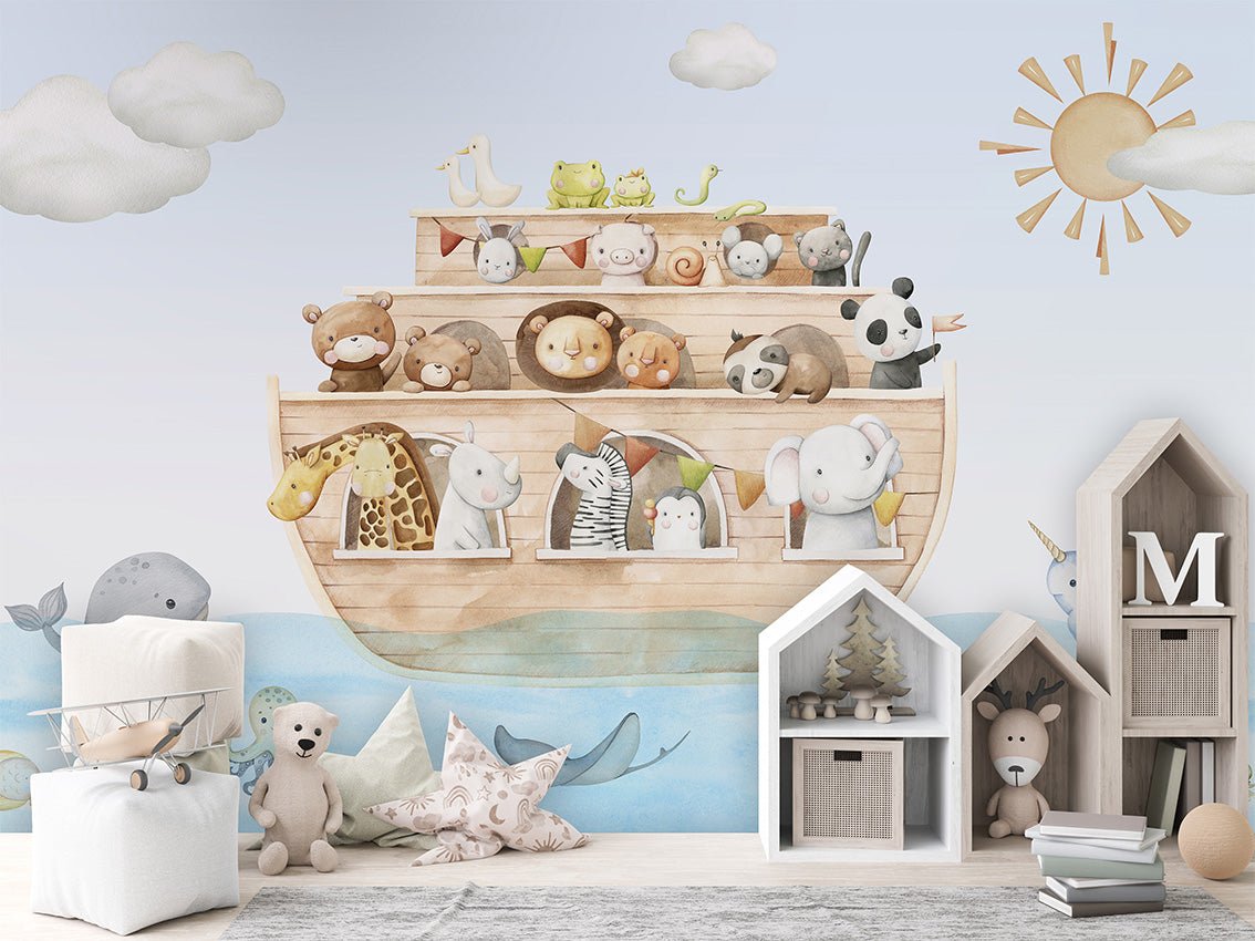 If you're looking for a soft wallpaper to decorate your baby's room, choose our Noah's Ark wallpaper. This panoramic baby wallpaper simply tells the story of Noah's Ark. Accompanied by touching animals, your new bespoke baby wallpaper will awaken your child with every glance.