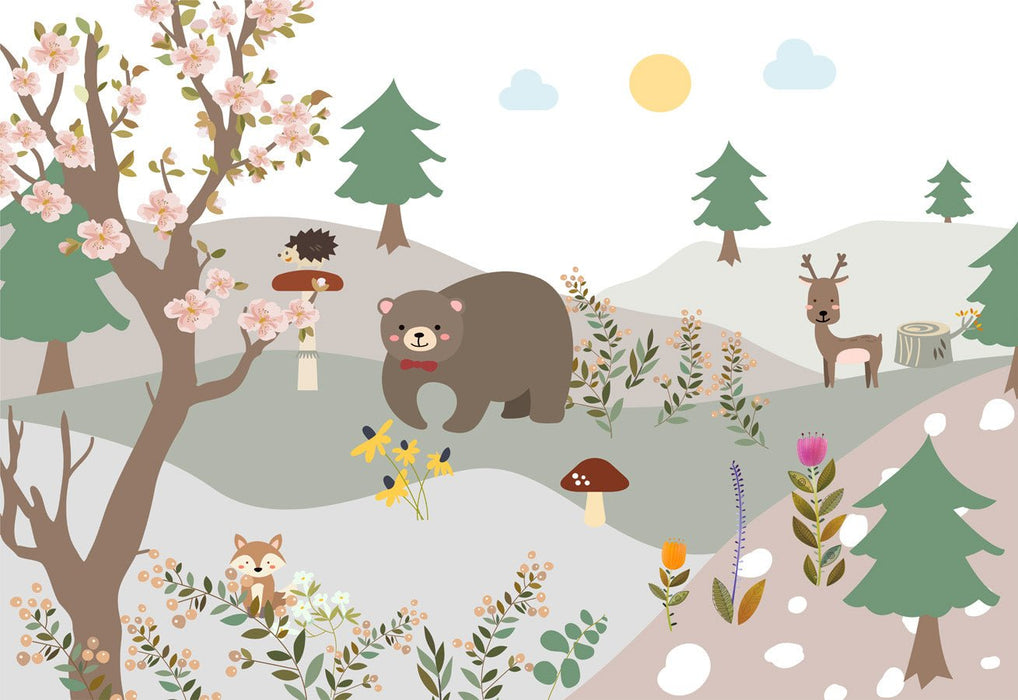 Bring softness and tenderness into your child's bedroom with this forest bear wallpaper. With its soft, variegated colors, its tender motifs will seduce your child and transport him to a fabulous universe. This wallpaper is ideal for toddlers' bedrooms. Easily create the imaginary world he's always dreamed of with our XXL custom wallpaper.