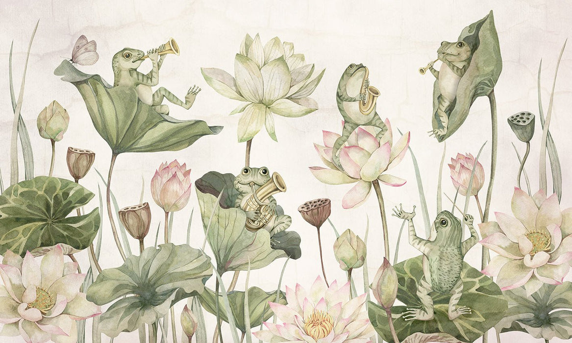 Ca va swinguer dans la chambre de votre enfant grâce au papier peint enfant grenouilles musicales ! Ce papier peint enfant présente des mignonnes grenouilles entrain de faire de la musique dans les fleurs et les nénuphars. Grâce à ses couleurs pastels et douces, ce papier peint autant dynamique sait apaiser votre enfant lors de ses moments de sieste et de repos. Idéal pour la chambre de bébé, ce décor mural éveillera ses sens, et développera ses facultés sensorielles.