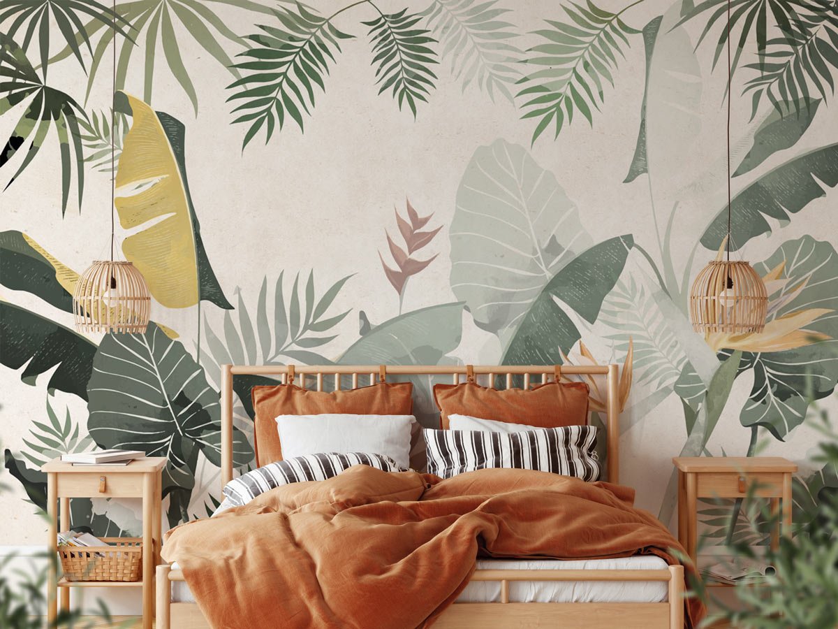 Ce revêtement mural tendance est idéal en association avec du mobilier rotin, bois, ou un parquet chêne. Créer une ambiance dépaysante et raffinée avec notre papier peint sur mesure végétal vert et jaune.