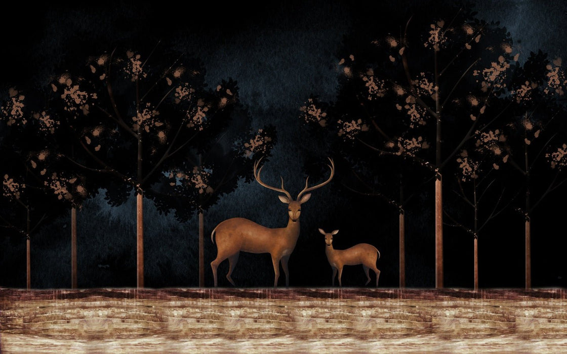 Discover our deer chic black forest wallpaper. This animal and forest tapestry is ideal for a bedroom, living room or office. A delicate, mysterious wall decoration that will bring comfort to your interior ambience. A single wall panel to personalize your room and make it sumptuous. An original panoramic wallpaper that will gently transform your room.