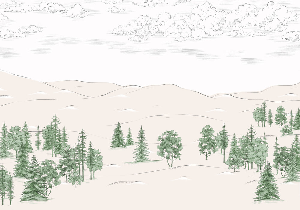 Plongez dans l'atmosphère enchanteresse des sommets avec notre papier peint panoramique "Esquisse des Cimes" version bicolore vert fôret beige lin. Cette création française, réalisée avec soin et passion, capture la majesté des montagnes avec des dessins au crayon d'arbres, de hêtres et de nuages entrelacés dans des teintes de beige et de vert forêt.