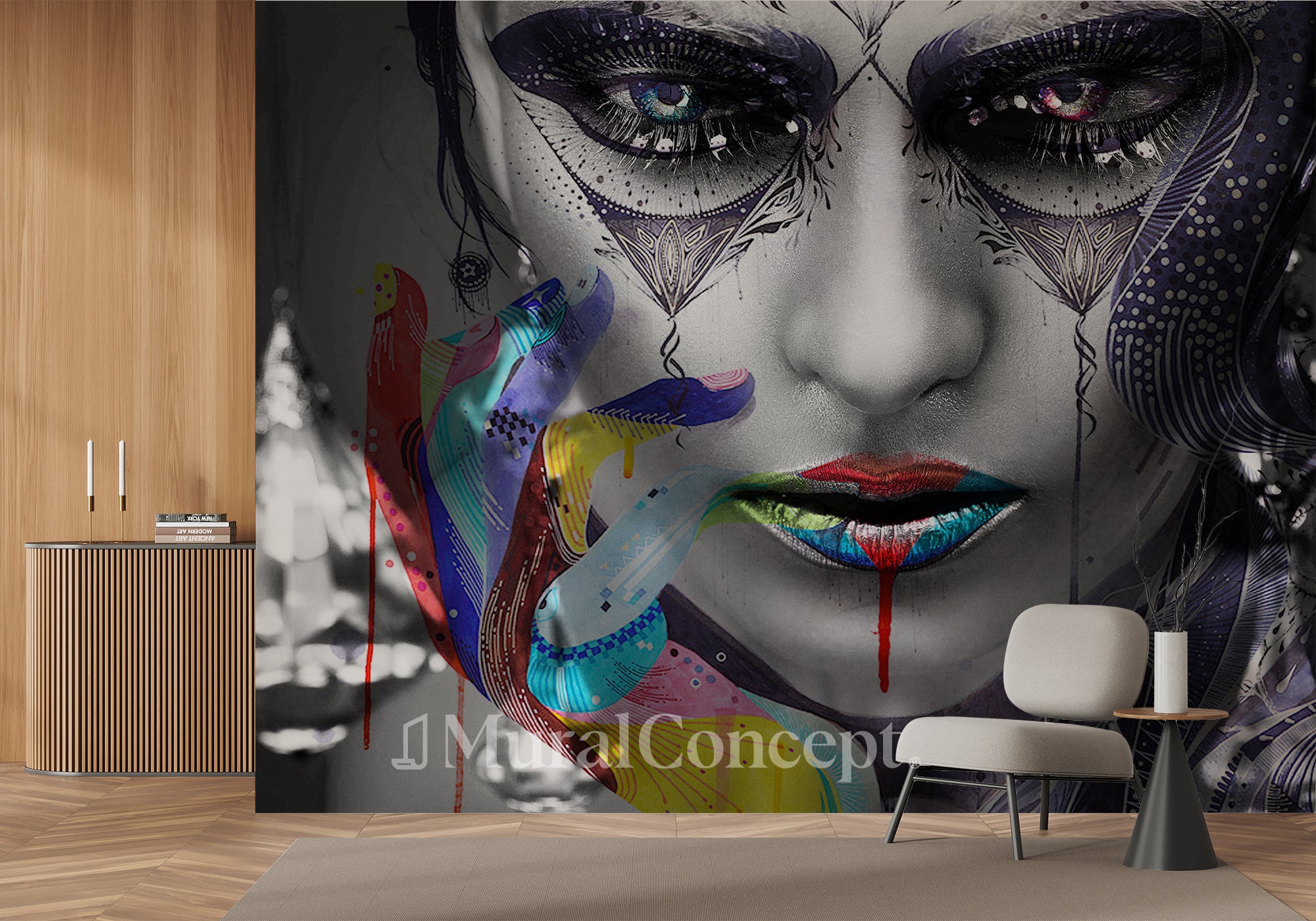 Motifs inspired by urban art, this panoramic wallpaper ethnic face Graffiti will create a trendy universe in your interior. Ideal for a modern, colorful, and urban atmosphere. If you are looking for an original decoration, you just aim with this wall decor! Easily create a street art decoration with our panoramic wallpaper to your measurements.