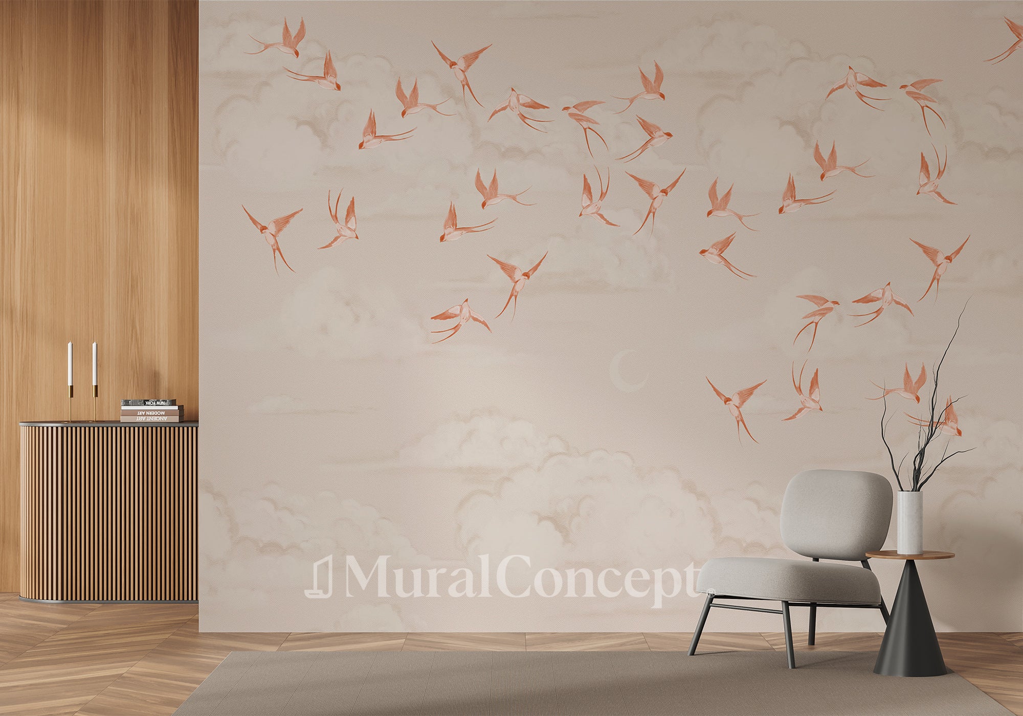 The poetic terracotta children's bedroom wallpaperenhances the decoration of your child's or baby's bedroom. With its soft terracotta colors, the atmosphere will be restful and touching. The flight of these little birds will give your child a breath of freedom. A panoramic wallpaper ideal for decorating your baby's room. Put up a wall decoration to transform your decor. Let your spirit travel with a made-to-measure wallpaper. This ecological wallpaper is made to measure.