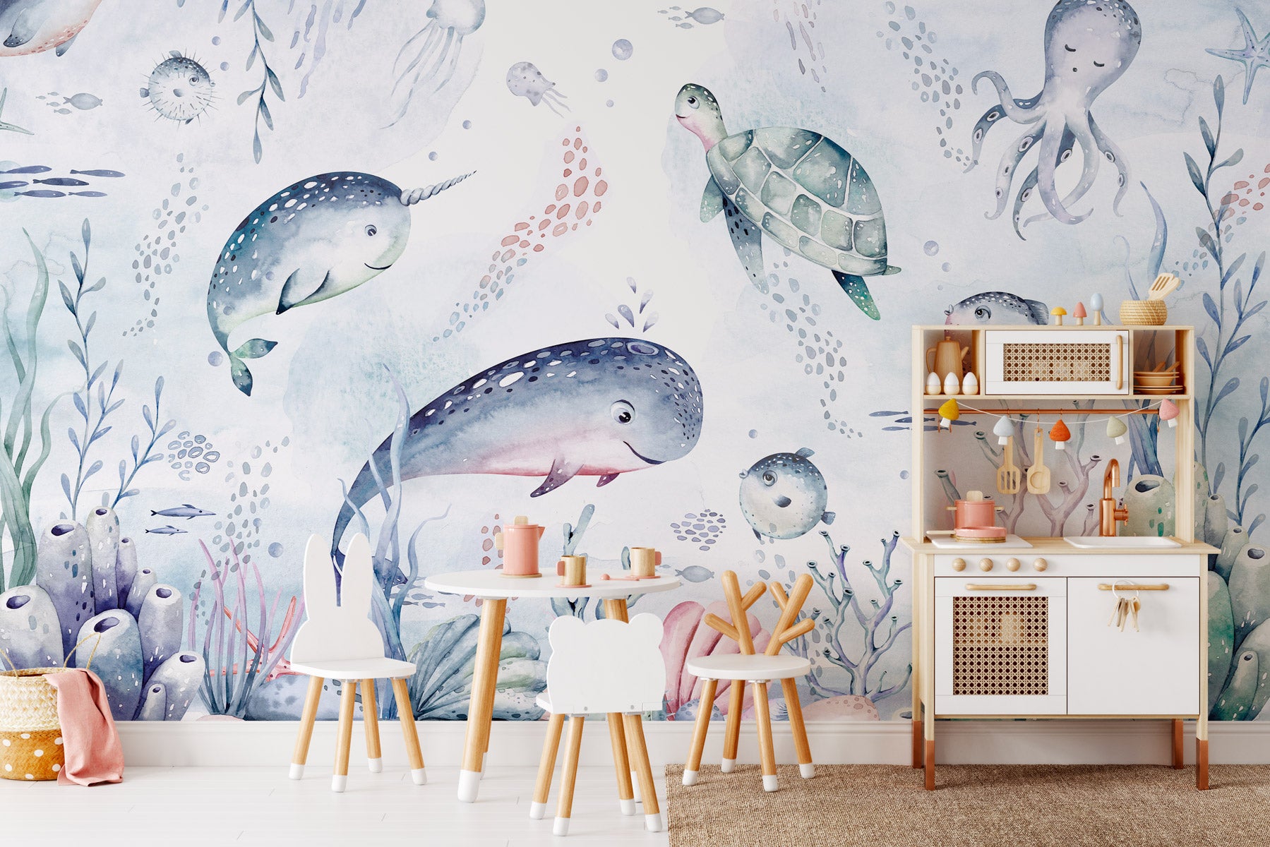 Your baby's or child's bedroom is enhanced by our new fairytale ocean whale wallpaper. This blue oceanic wallpaper, with its watercolor designs, softens and soothes the atmosphere in your child's room. Ideal for supporting your child's development, this whale wallpaper tells tender stories. Let's plunge together between dolphins, whales, fish and corals to marvel and learn while having fun.