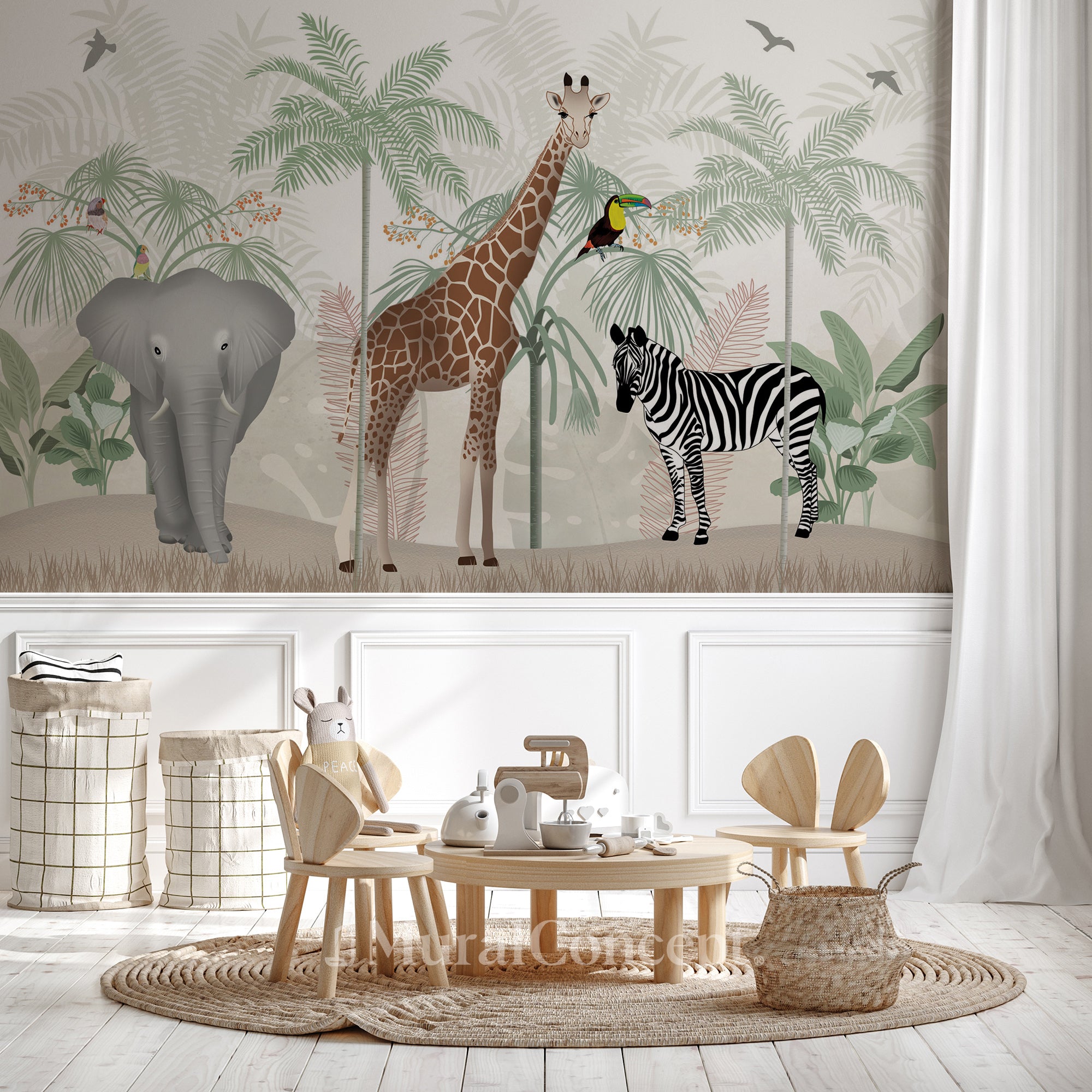 Avec notre Papier peint enfant animaux de la savane, c'est comme si vous étiez au cœur d'un safari. Retrouvez les animaux préférés de vos enfants dessinés sur ce papier peint panoramique comme le zèbre, l'attachante girafe, le toucan. Autant de compagnon pour accompagner les nuits de votre enfant. Les couleurs naturelles de cette création murale permettent d'accorder la décoration de la pièce très facilement.
