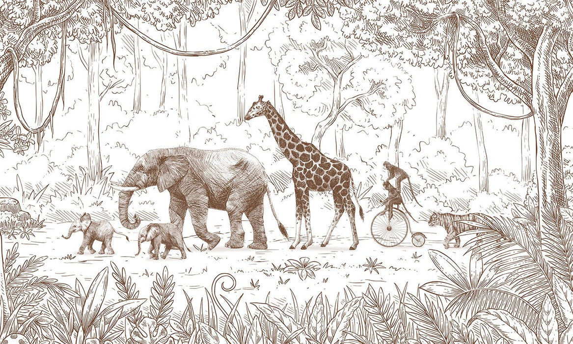 Le papier peint jungle enfant monochrome en couleur sépia est le papier peint idéal pour décorer la chambre de votre enfant avec goût et personnalisation. Ce papier peint panoramique jungle enfant est fabriqué sur mesure, pour un résultat époustouflant et sublime. Une fresque murale enfant qui représente les animaux de la savane : éléphants et girafe pour raconter à votre enfant de belles histoires.