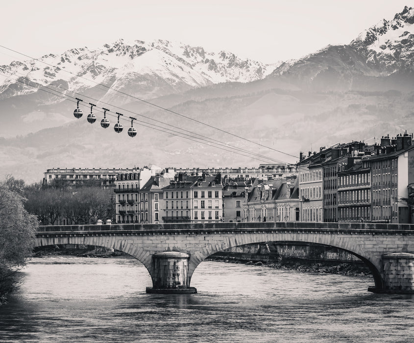 Apportez une touche d’élégance urbaine à votre intérieur avec ce papier peint panoramique noir et blanc de Grenoble, mettant en scène la célèbre Bastille surplombant la ville avec les bulles. Idéal pour créer une ambiance contemporaine, ce visuel grand format transforme votre mur en une véritable fenêtre artistique sur les Alpes.