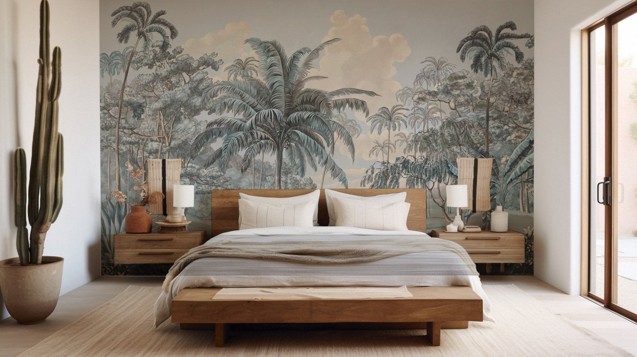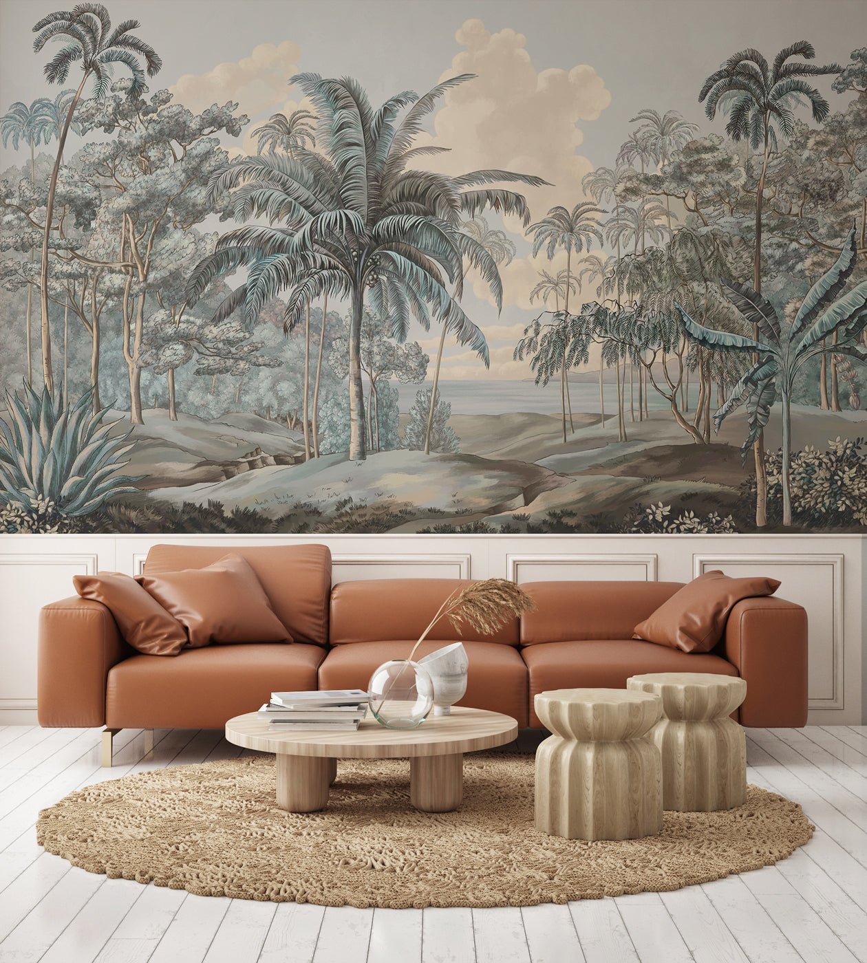 Laissez-vous envoûter par la splendeur d'un papier peint paysage bleuté style indonésien de l'île des Célèbes. Ce décor mural exceptionnel, où chaque détail est soigneusement dessiné à la main, évoquant l'essence même d'une peinture botanique luxuriante. Avec une profusion de flore abondante, ce chef-d'œuvre mural transforme instantanément n'importe quelle pièce en un jardin enchanté. Les couleurs éclatantes et vibrantes captivent les sens, créant une expérience visuelle qui éveille l'âme et évoque des émotions profondes.