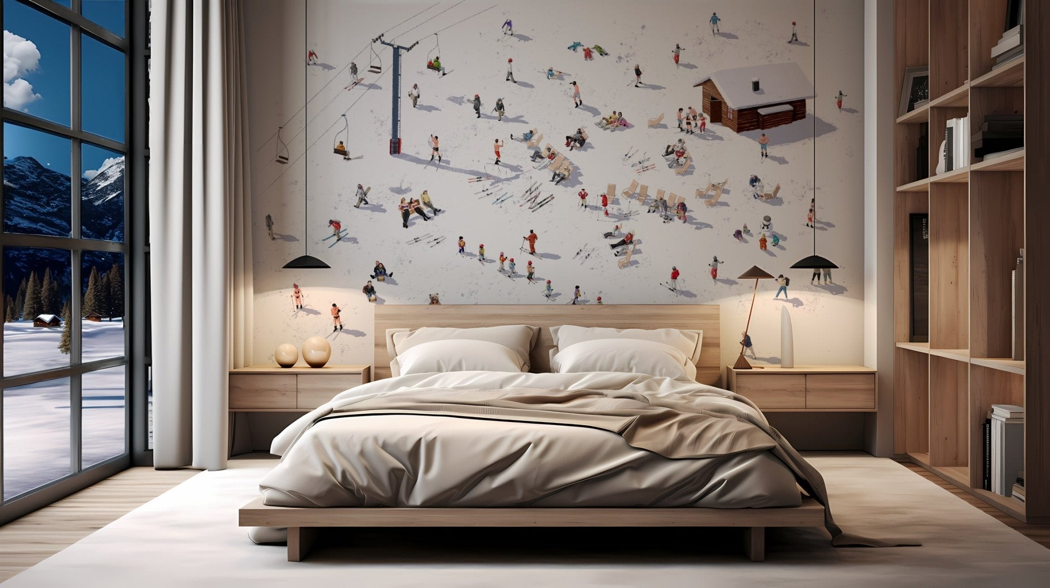 Invitez la magie des Alpes chez vous avec ce papier peint montagne illustré, parfait pour capturer l’essence joyeuse et nostalgique de l’après-ski. Entre skieurs qui bronzent, télécabines en mouvement, enfants à l’école de ski, descentes en luge et groupes d’amis partageant un chocolat chaud ou un moment au bar, chaque détail respire la convivialité et les souvenirs précieux des vacances en montagne.