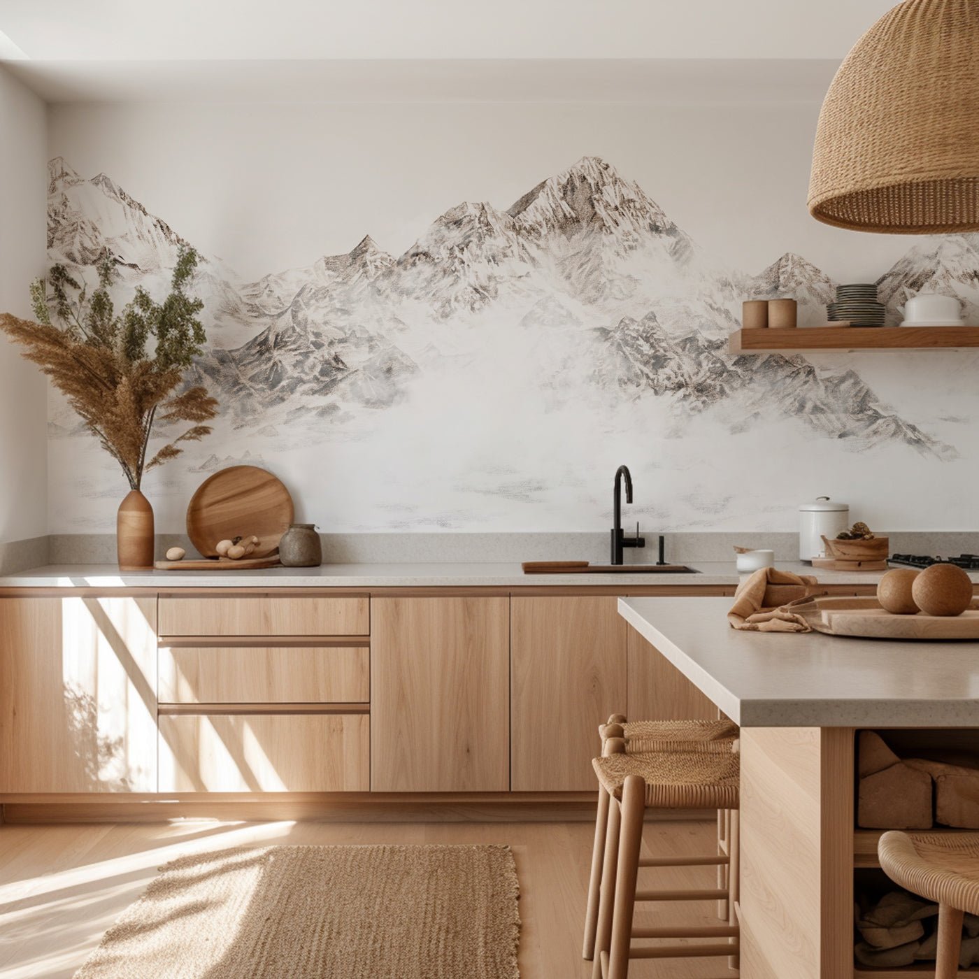 Transform your interior with this high-end wallpaper, a unique illustration of Mount Everest, between bewitching mist and majestic relief. Conceived in pencil, enhanced by light sepia shades, it subtly illuminates the space while offering striking depth. A panoramic that will bring emotion to your interior.